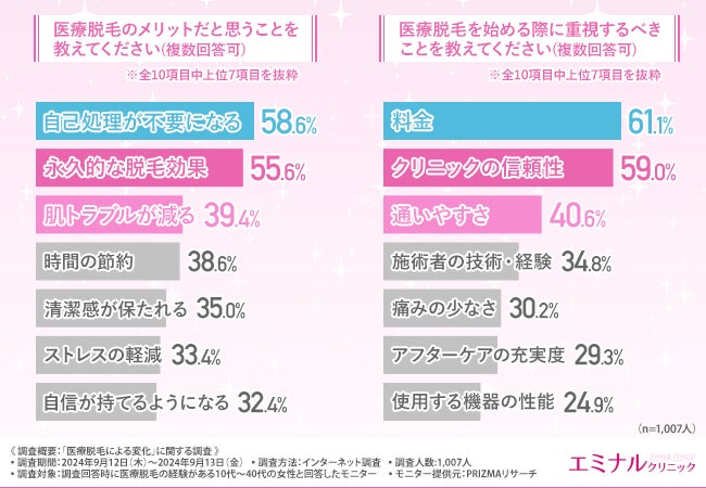 今回の調査結果により、医療脱毛の経験がある10代から40代の女性が医療脱毛を始めたきっかけや、医療脱毛を受けることで実感したメリットが明らかになりました。