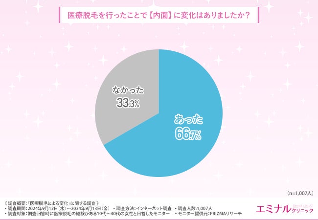 そこで、「医療脱毛を行ったことで【内面】に変化はありましたか?」と質問したところ、約7割の方が『あった(66.7%)』と回答しました。