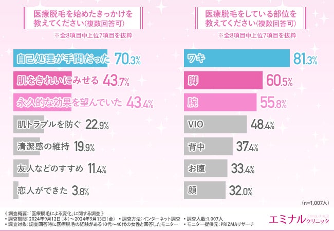 そこで、医療脱毛の「エミナルクリニック」は、医療脱毛の経験がある10代~40代の女性を対象に、「医療脱毛による変化」に関する調査を行いました。