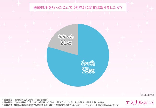 「医療脱毛を行ったことで【外見】に変化はありましたか?」と質問したところ、8割近い方が『あった(79.6%)』と回答しました。