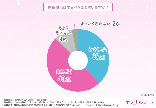 「医療脱毛はするべきだと思いますか?」と質問したところ、約9割の方が『とても思う(38.2%)』『まあ思う(49.2%)』と回答しました。