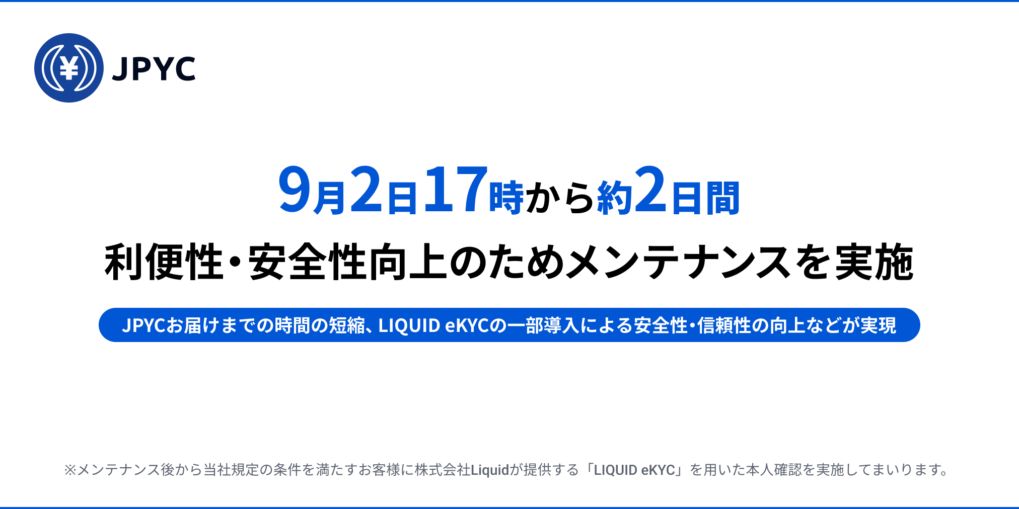 本メンテナンスにより「JPYCお届けまでの時間の短縮」「LIQUID eKYCの一部導入による安全性・信頼性の向上」「ウォレットログインによるミスのない注文」が実現いたします。