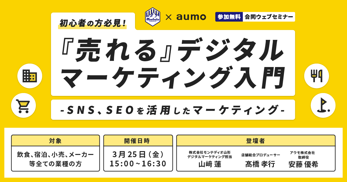 モンテディオ山形とアウモが連携する取り組みのスタートとして、2022年3月25日に、山形県内の飲食店や宿泊施設、観光施設の運営企業向けに「『売れる』デジタルマーケティングセミナー入門 -SNS、SEOを活用したマーケティング-」を実施します。