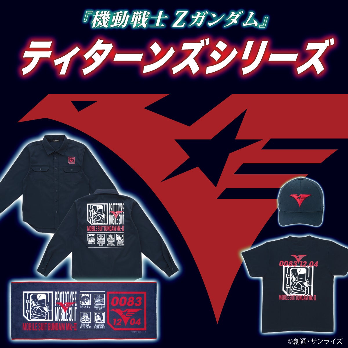 マークの他にも「ティターンズ」が発足した「宇宙世紀0083年12月4日」を表すデザインや、人気MS(モビルスーツ)「ガンダムMk-II」のデザインを落とし込んでいます。