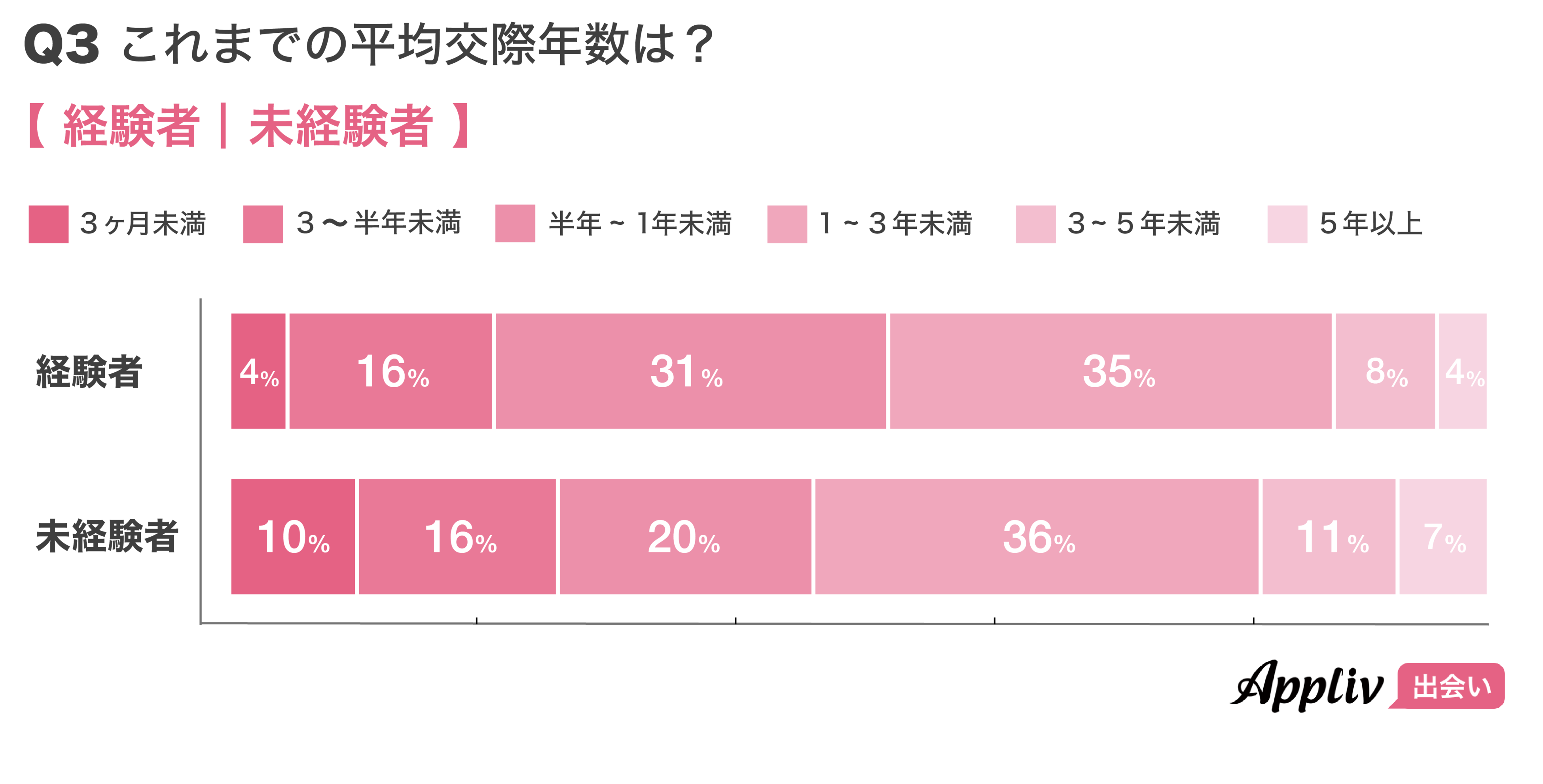 最も期間が短い「3ヶ月未満」と回答した人の割合は、マッチングアプリ未経験者の方が高く、経験者の2.5倍でした。マッチングアプリでは恋人を探している同士が出会うので、短期間で恋人と別れる人は比較的少ないのかもしれません。