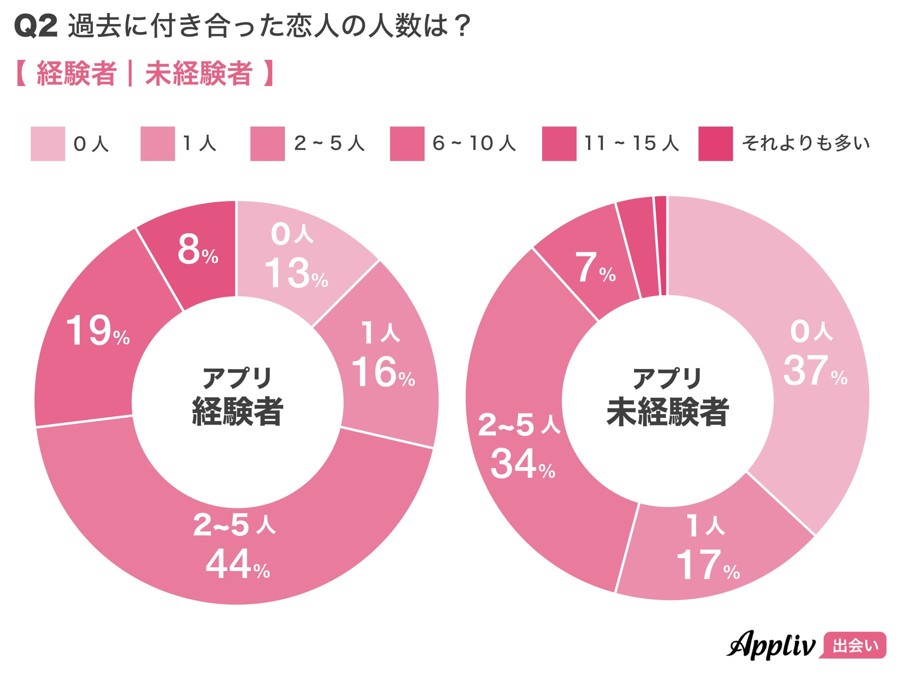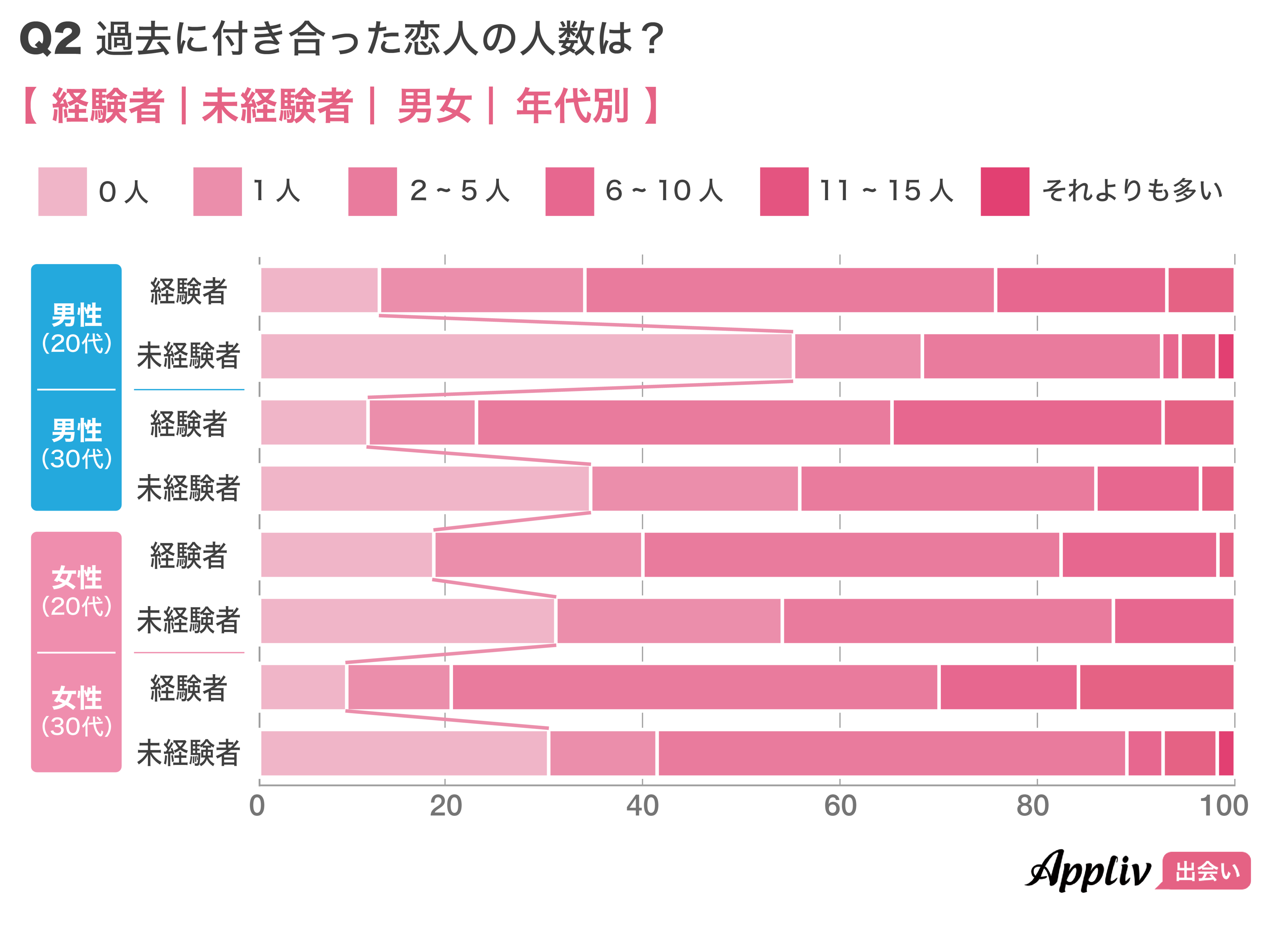 マッチングアプリ経験者と比較すると、未経験者の方が交際人数が少ないことから、マッチングアプリで恋人を見つけている人が多いのではないかと考えられます。