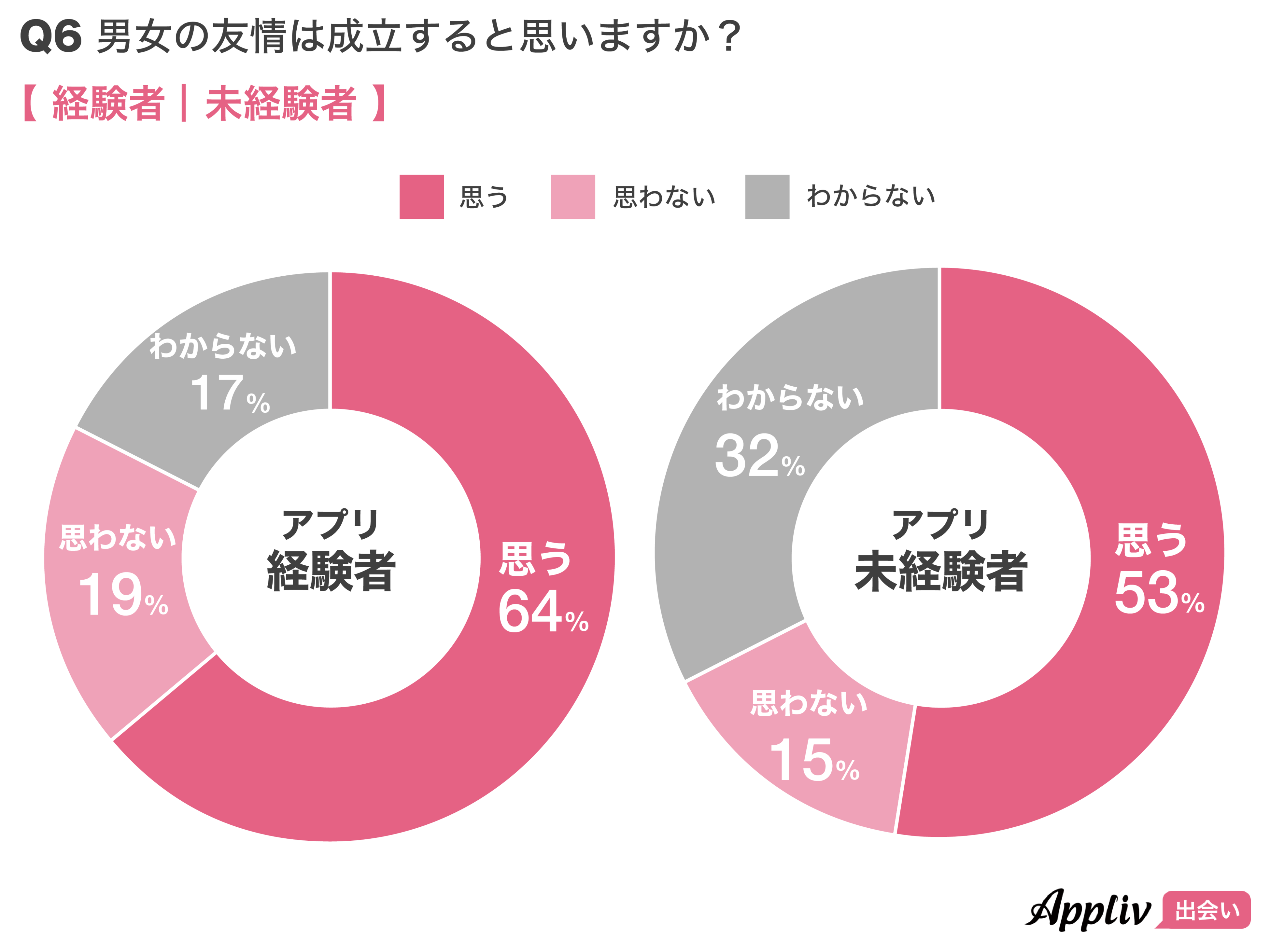 男女の友情は成立すると思うかをたずねたところ、マッチングアプリの利用経験に問わず過半数が「成立すると思う」と回答。「成立すると思わない」と回答した人は全体の約2割という結果に。