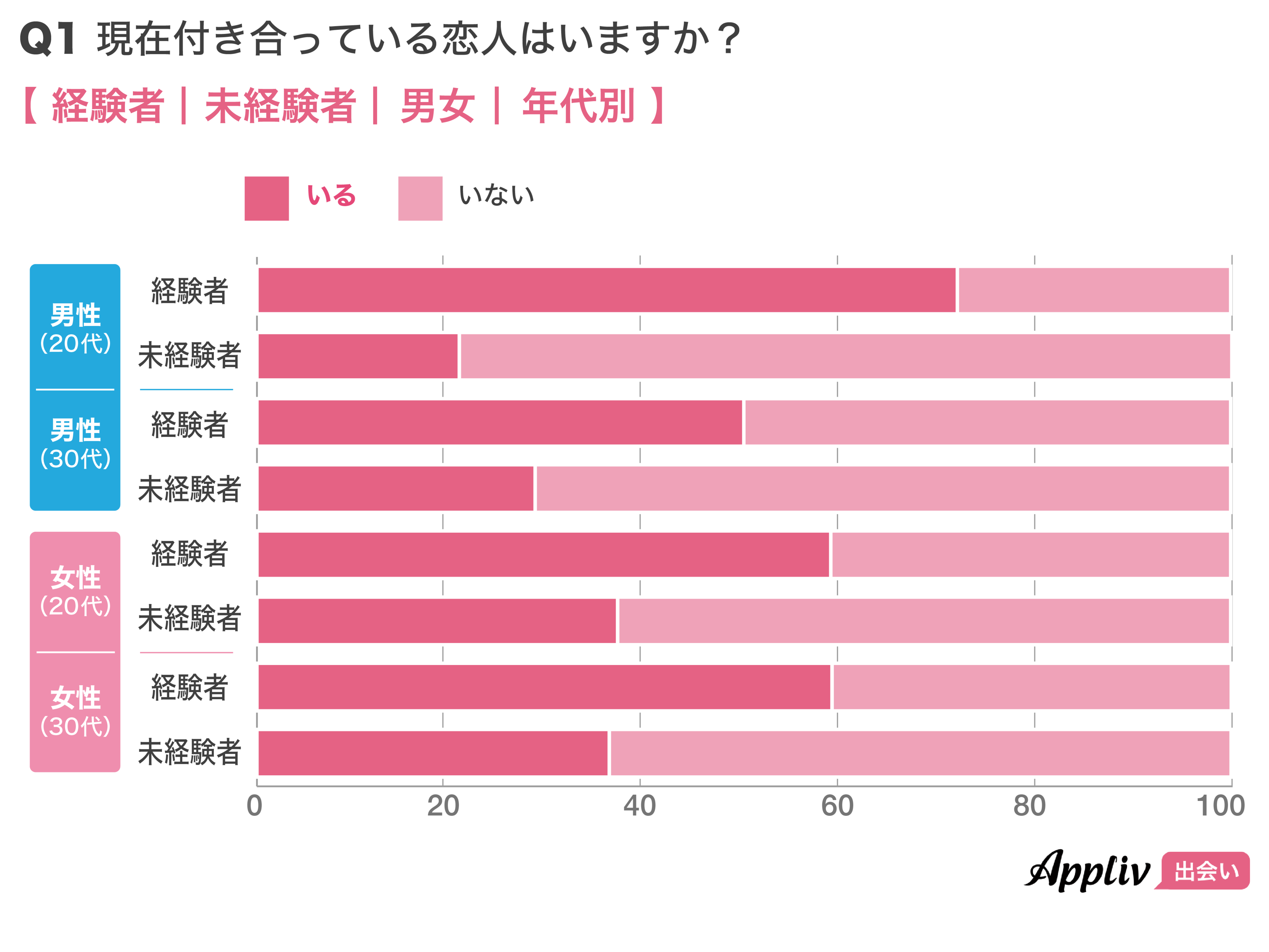 マッチングアプリ経験者の6割「恋人がいる」、未経験者の2倍!未婚男女400人の恋愛経験を調査(Appliv出会い)