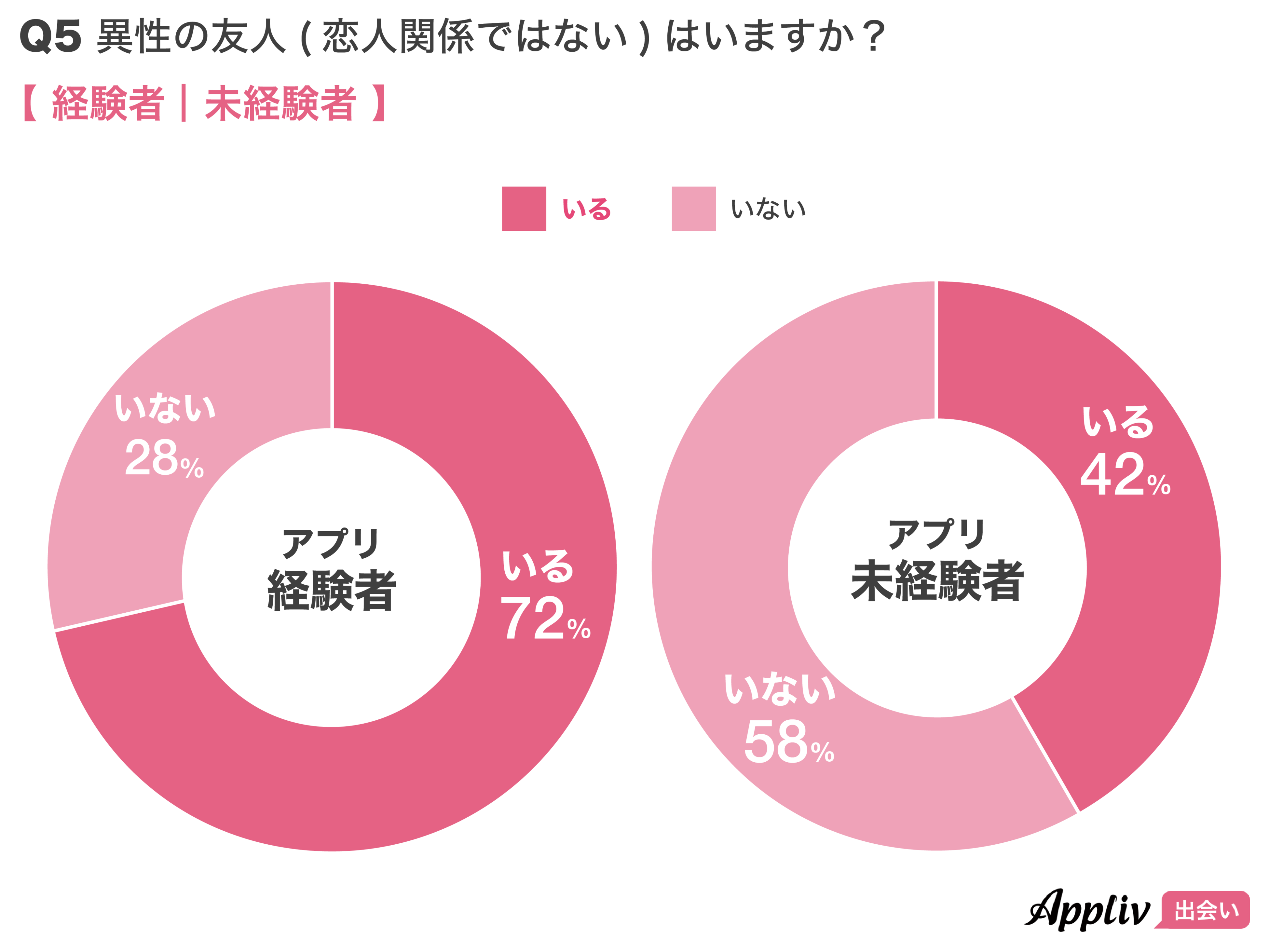 「異性の友人はいますか?」と質問をしたところ、「いる」と回答したのはマッチングアプリ経験者が72%、未経験者が42%でした。