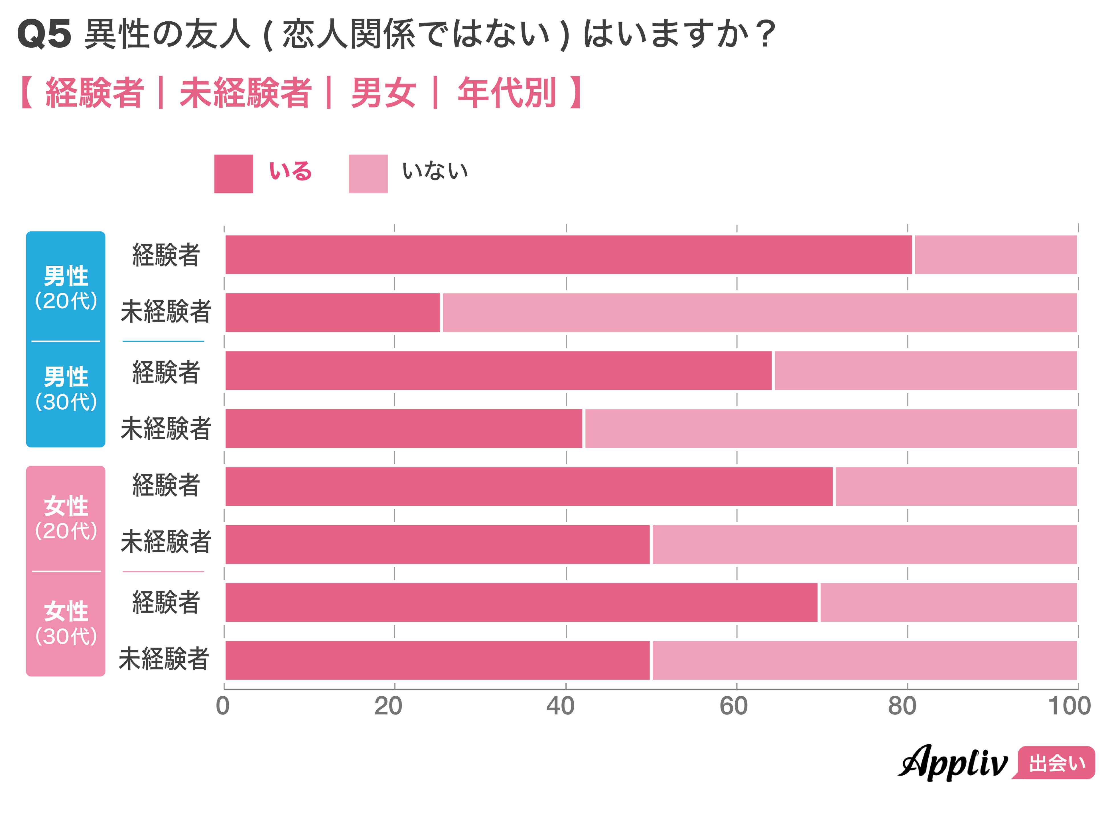 - マッチングアプリ経験者の7割が「異性の友人いる」、未経験者の約2倍