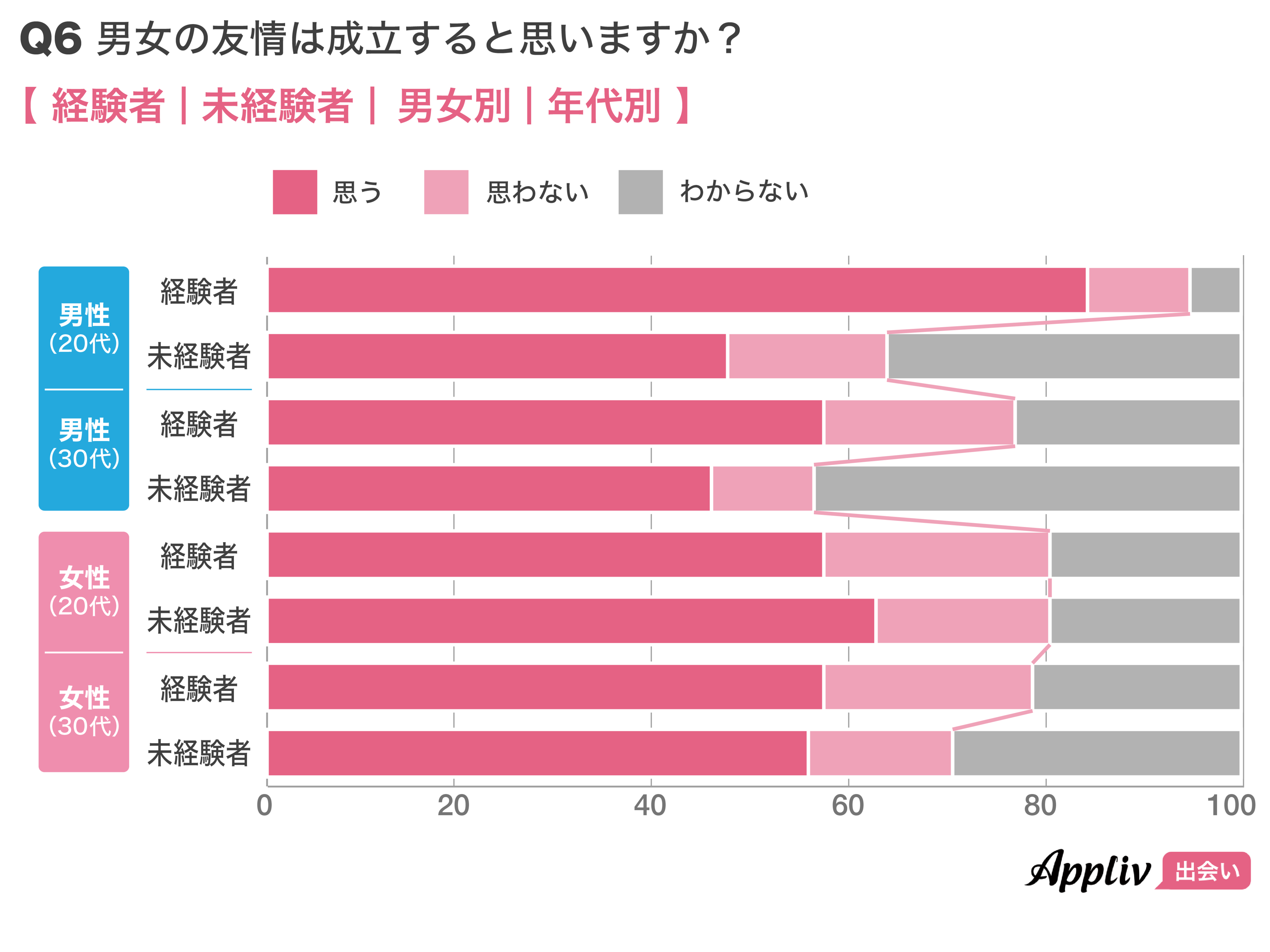 性・年代別で違いがあるのかを見たところ、20代男性のマッチングアプリ経験者で「男女の友情が成立すると思う」と回答した割合が全体の8割を超えました。これは、同じ20代男性で未経験者の約2倍となっています。また、「分からない」の回答は女性よりも男性がやや多い結果でした。