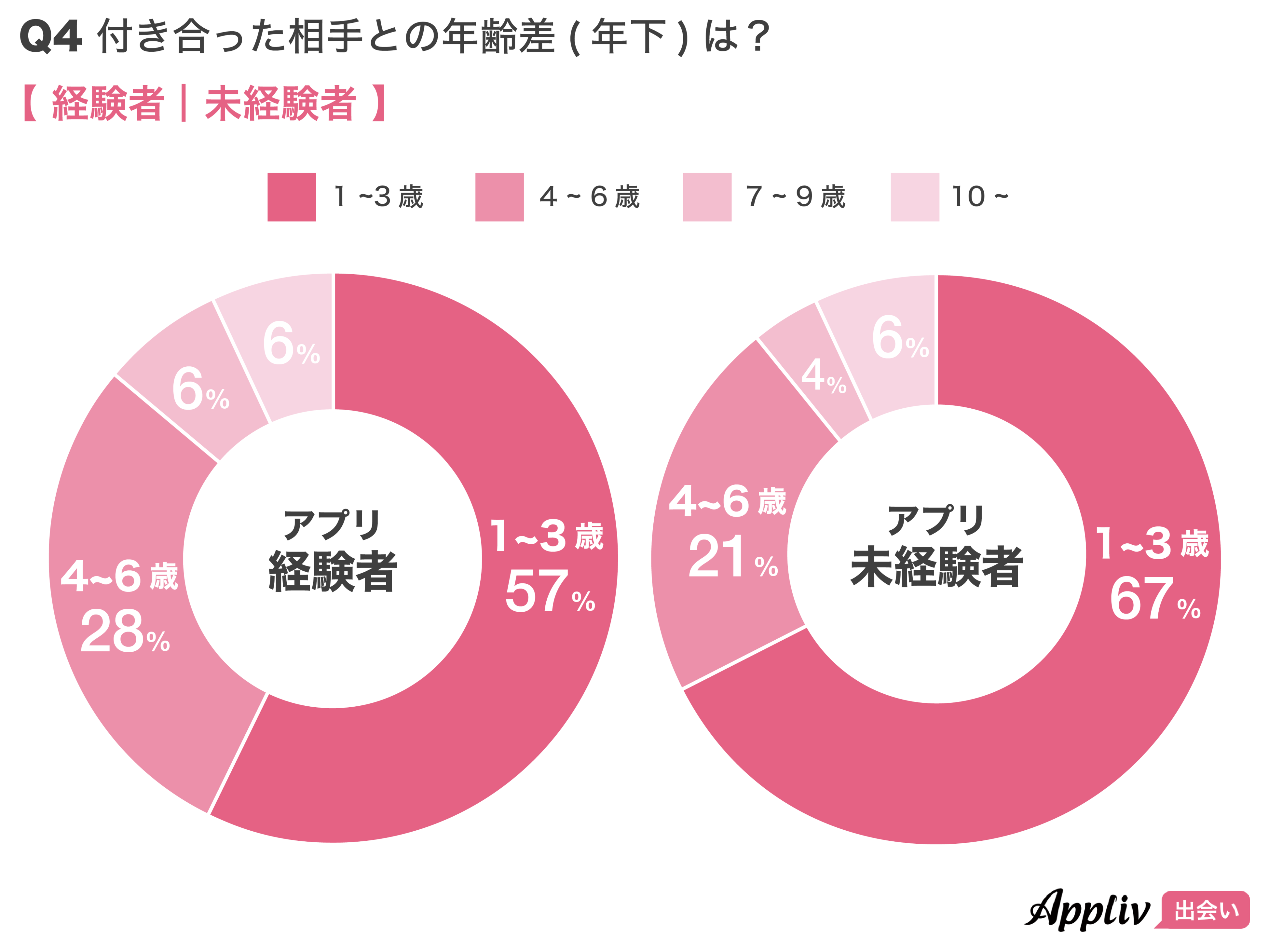 続いて、過去に付き合ったことのある恋人との年齢差(最も年齢が離れている相手との年齢差)をたずねてみたところ、最も回答が多かったのはマッチングアプリ経験者・未経験者のどちらも、上下「1~3歳差」でした。