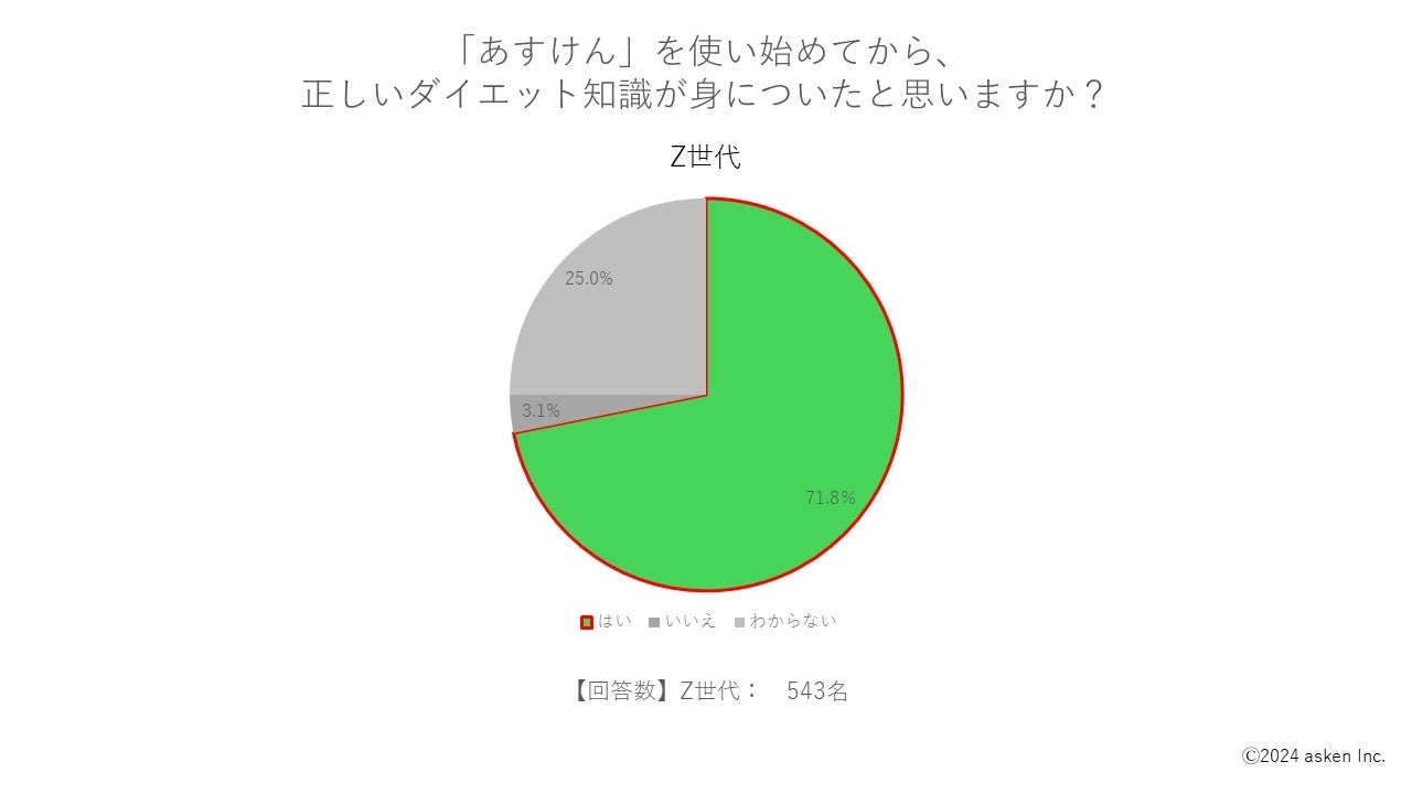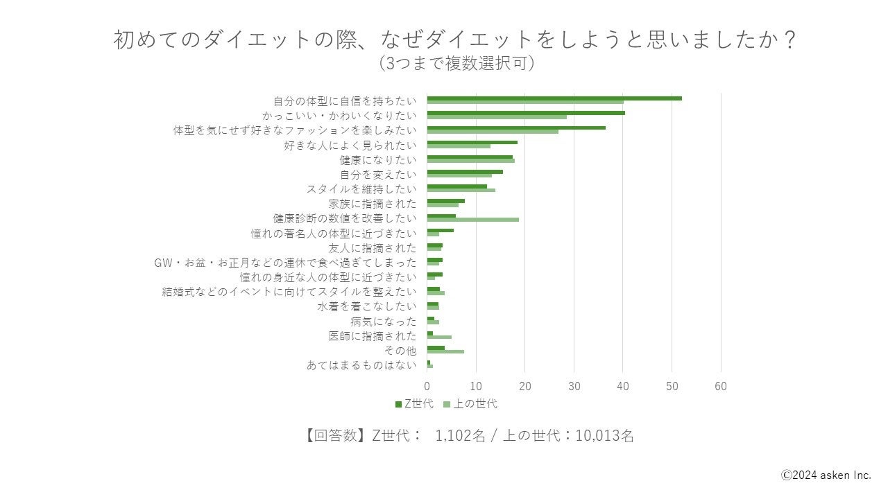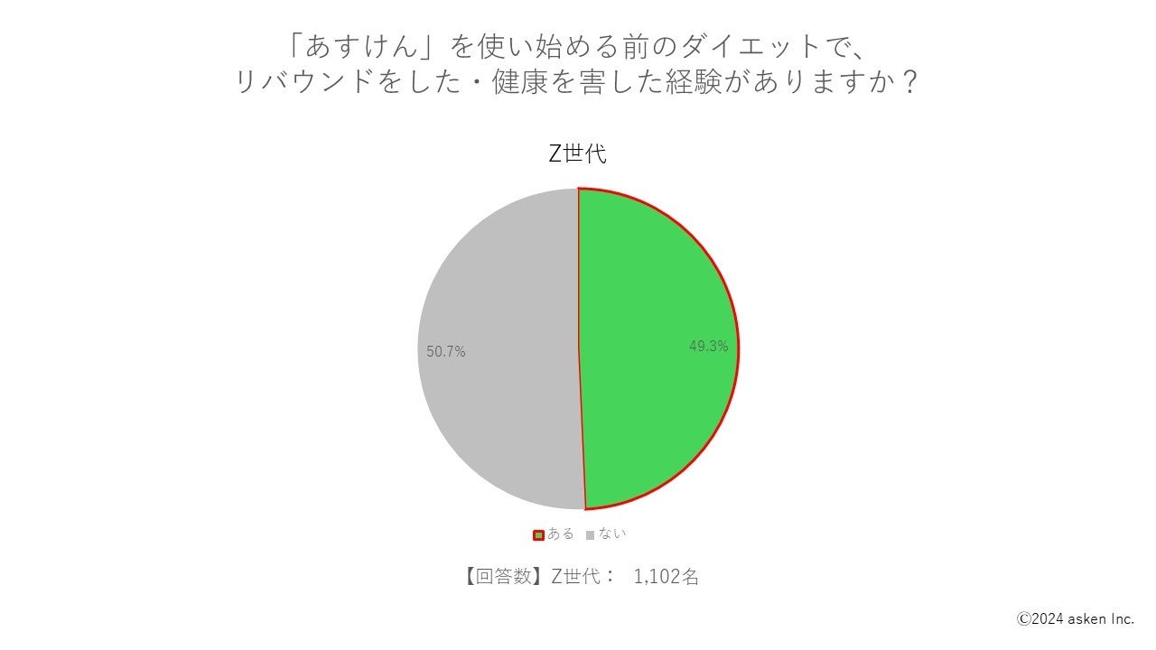 累計会員数1000万人超・国内No.1*¹のAI食事管理アプリ『あすけん』の開発・運営を行う株式会社asken(東京都新宿区、代表取締役社長 中島洋、以下「当社」)は、『あすけん』を利用しているユーザーを対象に、「ダイエットに関する意識調査」を実施、うち1,102名のZ世代(※1)による回答をもとに「Z世代のダイエットに関する意識調査(以下:本調査)」を作成・発表いたしました。