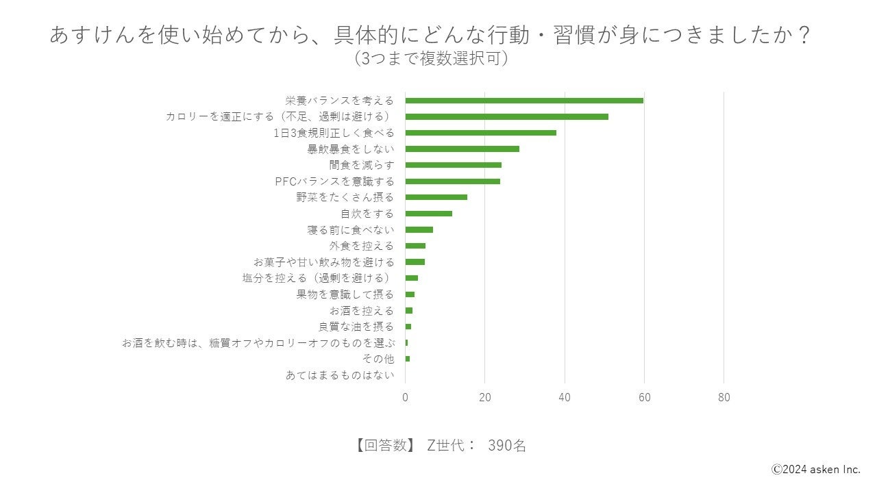 さらに、上記質問に「はい」と答えた人に対して「『あすけん』を使い始めてから、具体的にどんな行動・習慣が身につきましたか?(3つまで複数選択可)」という質問に対しては、「栄養バランスを考える(59.7%)」「カロリーを適正にする(不足、過剰は避ける)(51.0%)」「1日3食規則正しく食べる(37.9%)」が上位にランクインしています。