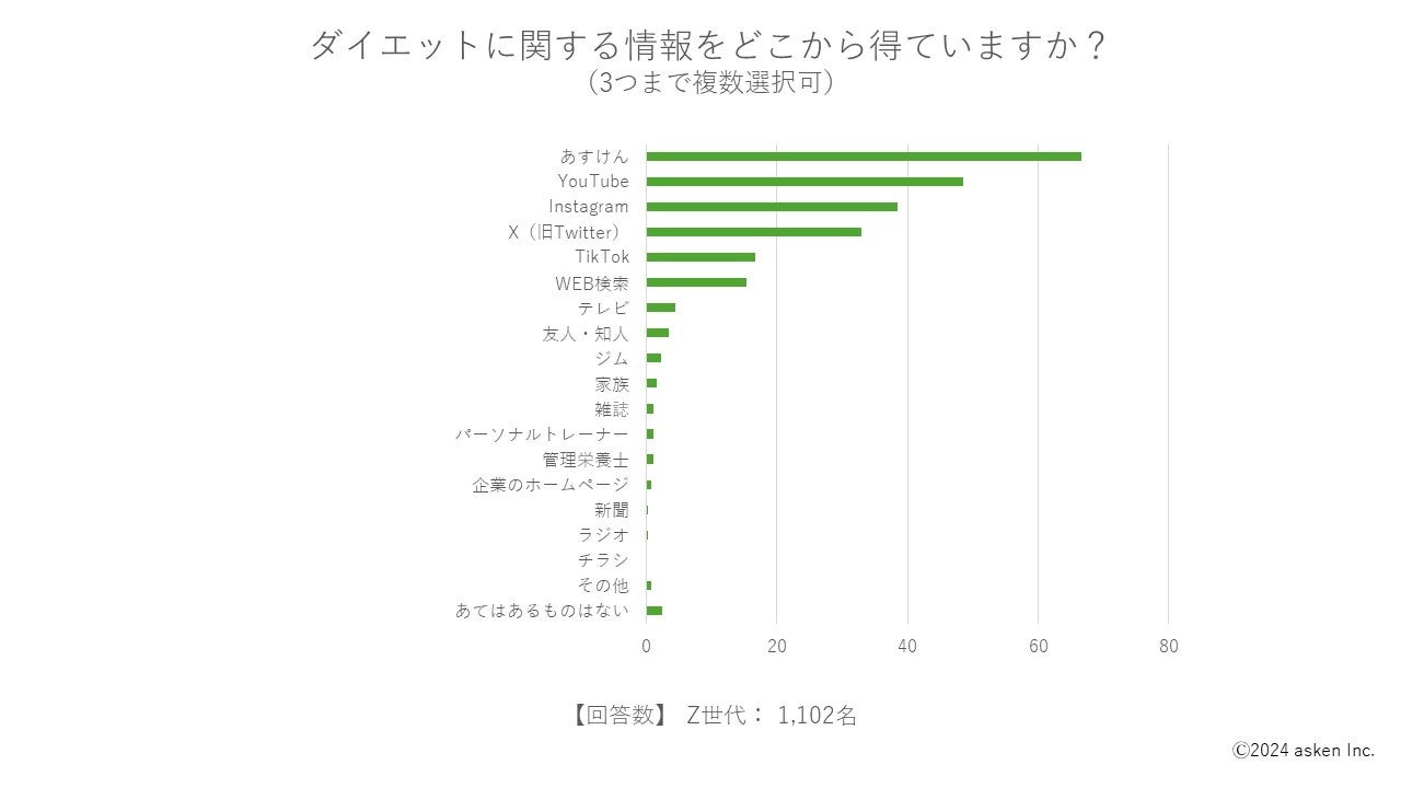 「ダイエットに関する情報はどこから得ていますか?(3つまで複数選択可)」という質問に対して、「あすけん(66.7%)」「YouTube(48.5%)」が上位にランクイン。また、「Instagram(38.4%)」「X(33.0%)」「TikTok(16.7%)」といったSNSが上位にランクインする傾向が見られました。