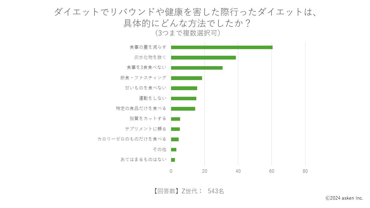 ダイエットをしたがリバウンドした・もしくは健康を害した経験がある人に、どんなダイエット方法を行っていたかを聞いたところ、第1位「食事の量を減らす(60.6%)」・第2位「炭水化物を抜く(38.7%)」・第3位「食事を3食食べない(30.8%)」となりました。また約2割(18.6%)が「断食・ファスティングを用いたダイエット」と回答しています。