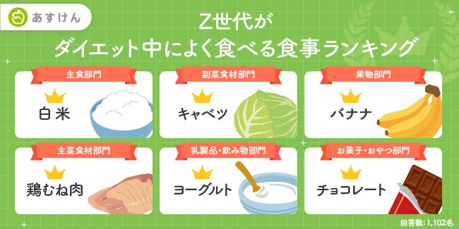 なお、ダイエット中に、もっともよく食べる食品についてもあわせてアンケートを実施したところ、各部門1位は【主食部門】白米、【主菜食材部門】鶏むね肉、【副菜食材部門】キャベツ、【乳製品・飲み物部門】ヨーグルト、【果物部門】バナナ、【お菓子・おやつ部門】チョコレートとなりました。