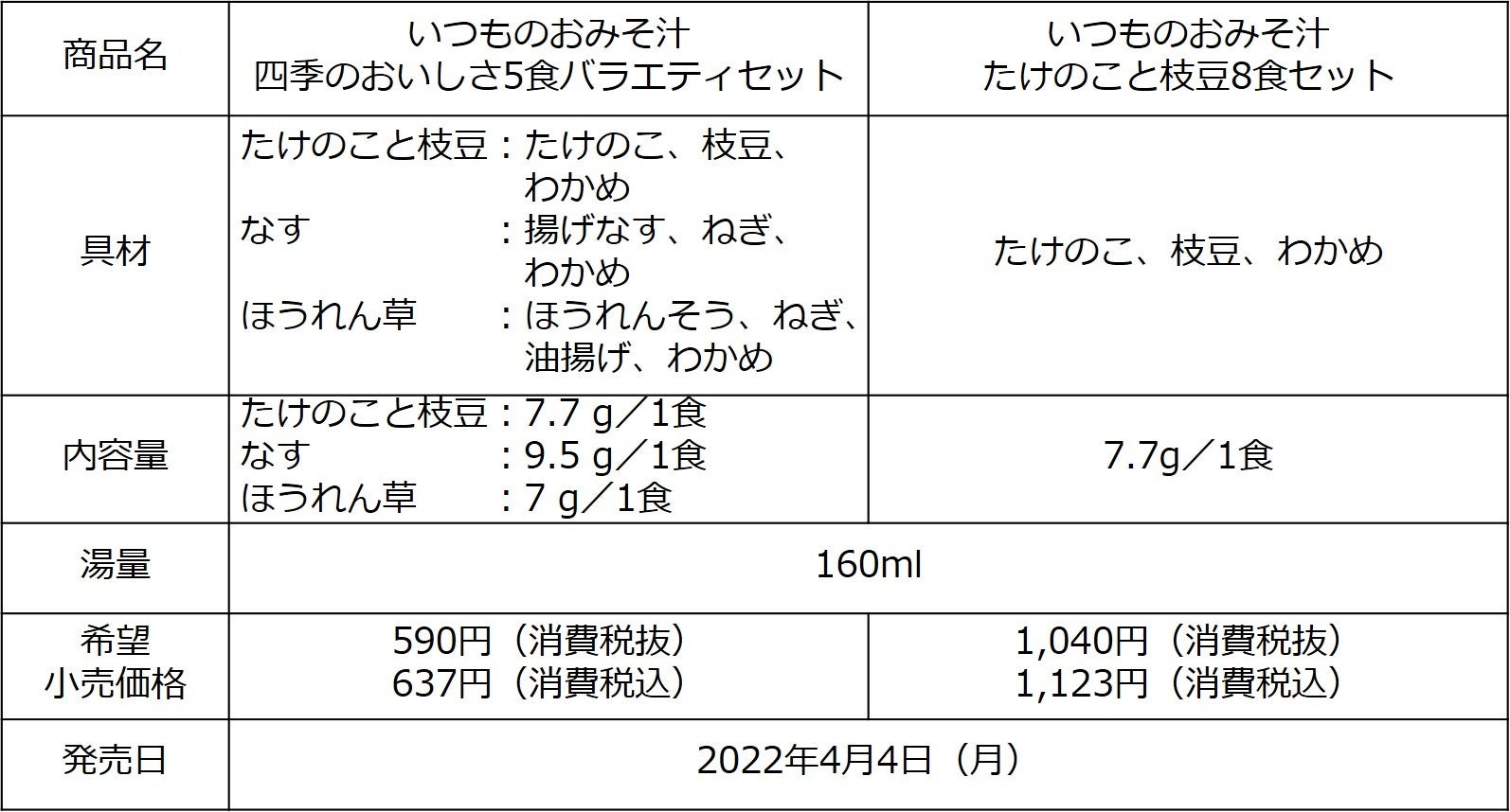 『いつものおみそ汁 四季のおいしさ5食バラエティセット』『いつものおみそ汁 たけのこと枝豆8食セット』4月4日新発売