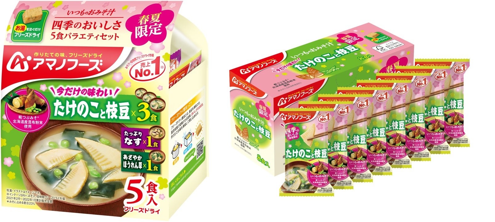 アサヒグループ食品株式会社(本社 東京、社長 川原浩)は、「アマノフーズ」ブランドの主力である「いつものおみそ汁」シリーズから、『いつものおみそ汁 四季のおいしさ5食バラエティセット』『いつものおみそ汁 たけのこと枝豆8食セット』を4月4日より期間限定にて全国で新発売します。