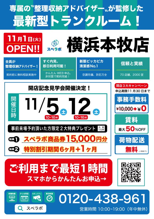 【11月1日(火)オープン】見学から契約、解約まで完全非接触・非対面、お申し込みからご利用まで最短1時間!絶賛運営中のトランクルーム【スペラボ】が横浜市本牧に出店!