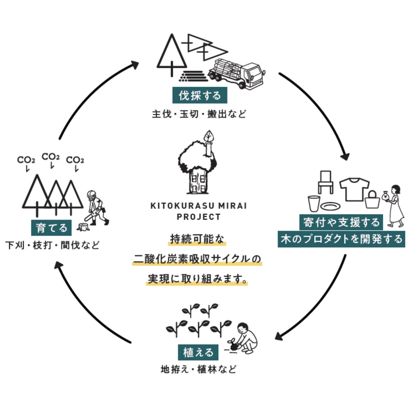 国内の各地域・企業と協働で森の保全活動を行うことから始まり、木の価値をあらためて見直し、木を活かした商品開発、サービス提供、情報発信、コミュニティの構築を経て、様々な人と森を「木を使った持続可能な事業」で結び、人々の木と暮らす永続的な未来を創造します。