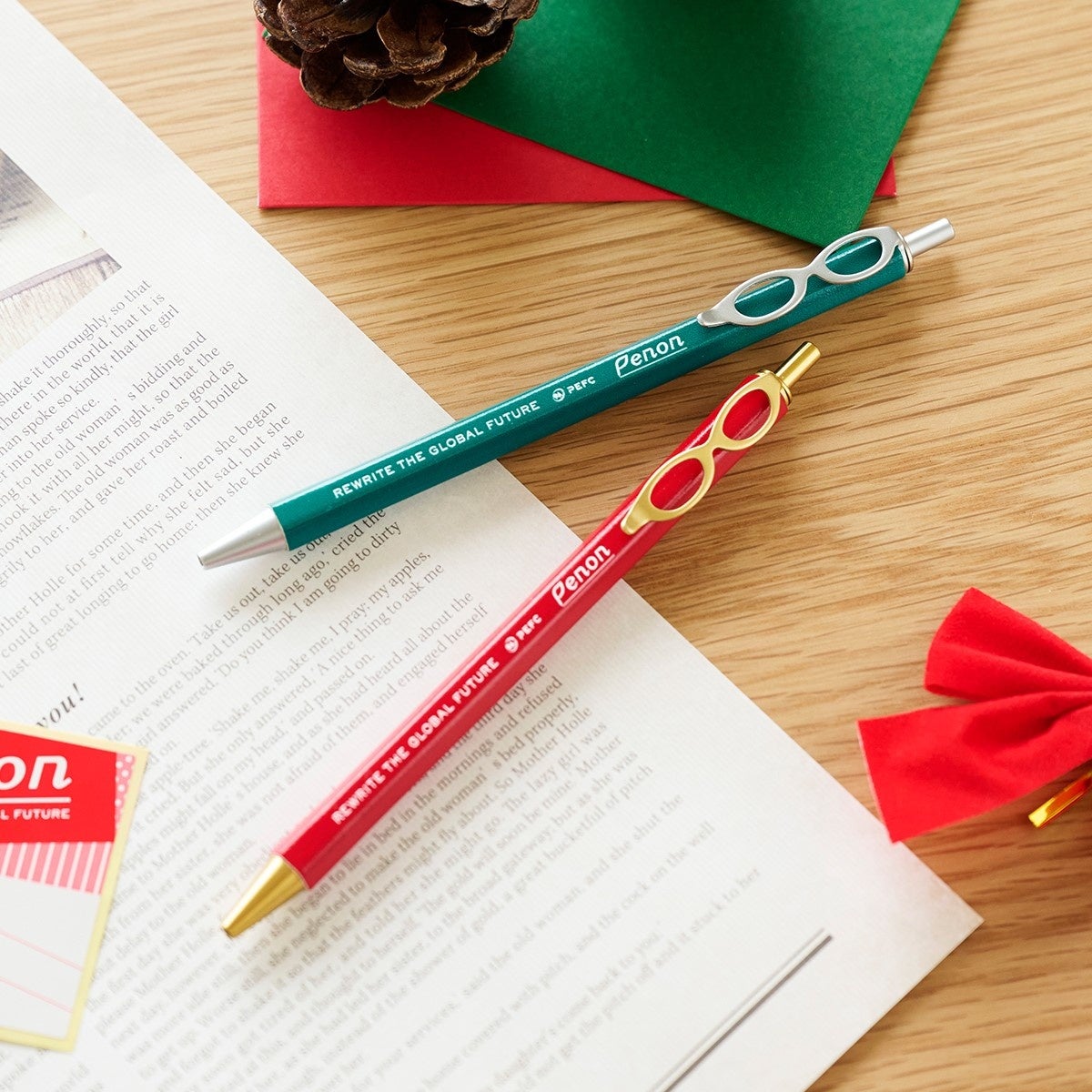 ゴールドとシルバーのメガネ型クリップがアクセントになったクリスマスギフトにぴったりのペンです。