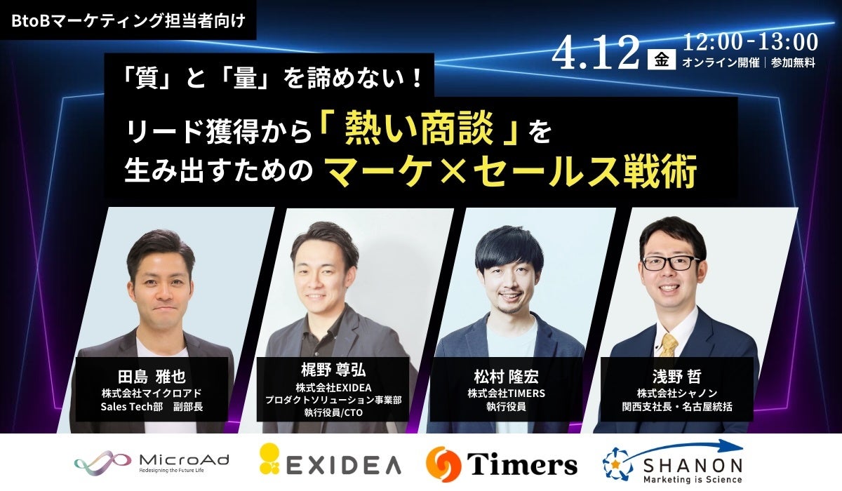 株式会社マイクロアド(本社:東京都渋谷区、代表取締役社長:渡辺健太郎、以下 マイクロアド)は、企業のBtoBマーケティング担当者に対し、株式会社EXIDEA、株式会社シャノン、株式会社TIMERSとともにオンラインセミナーを開催いたします。