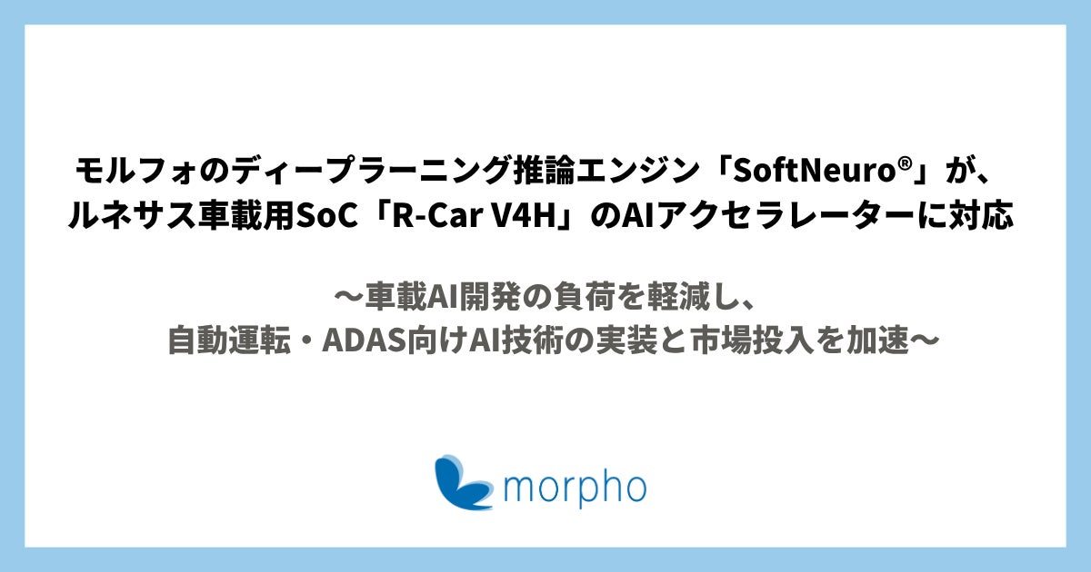 株式会社モルフォ(本社 : 東京都千代田区、代表取締役社長:平賀 督基、東証グロース市場:3653、以下 : モルフォ)は、独自開発した世界最速級のディープラーニング推論エンジン『SoftNeuro®』が、この度ルネサス エレクトロニクス株式会社(以下、ルネサス)の車載用SoC「R-Car V4H」搭載のAIアクセラレーターエンジンに対応したことを発表します。