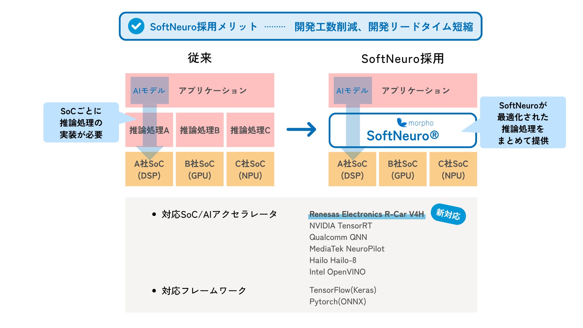 モルフォは今後も、AI推論エンジン「SoftNeuro」の対応プラットフォームを拡充し、車載分野におけるAI実装の効率化を支援してまいります。