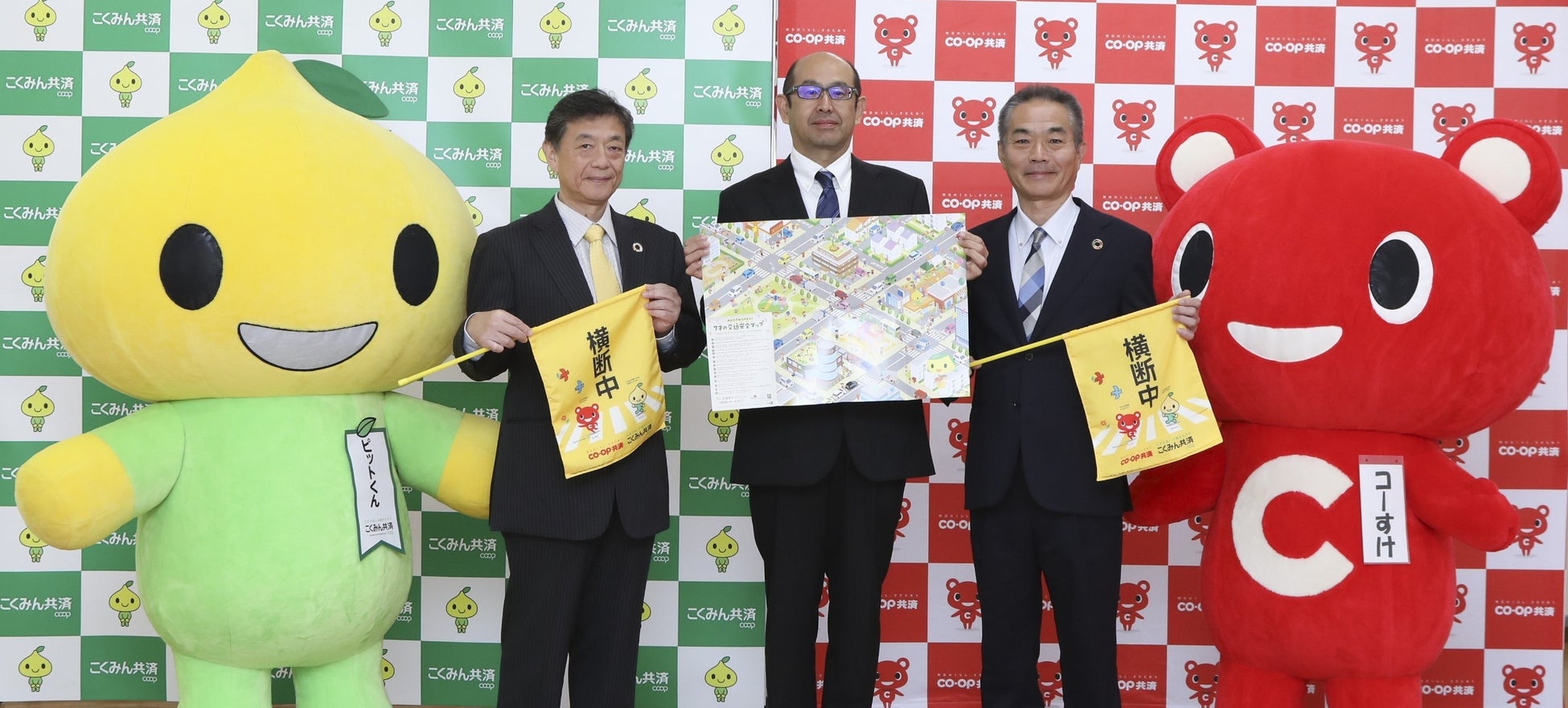コープ共済連会員生協(127生協)では、当会の「お車の補償」である「マイカー共済」を取り扱っており、組合員の安心なカーライフのためのお役立ちを行っております。また、コープ共済連会員生協組合員の「マイカー共済」見積もり1件につき、公式キャラクターがコラボした「ピットくん・コーすけコラボ横断旗」を寄贈しています。