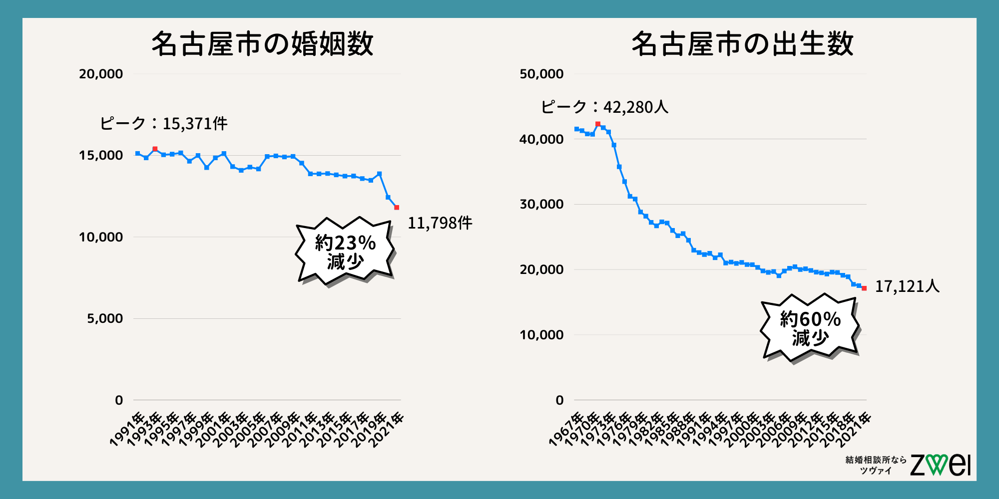 名古屋市の婚姻数・出生数は近年減少しており、1993年に15,371件だった名古屋市の婚姻件数は、2021年では11,798件と約23%減少(※1)。出生数は1971年の42,280人から、2021年には17,121人と約60%減少しています(※2)。