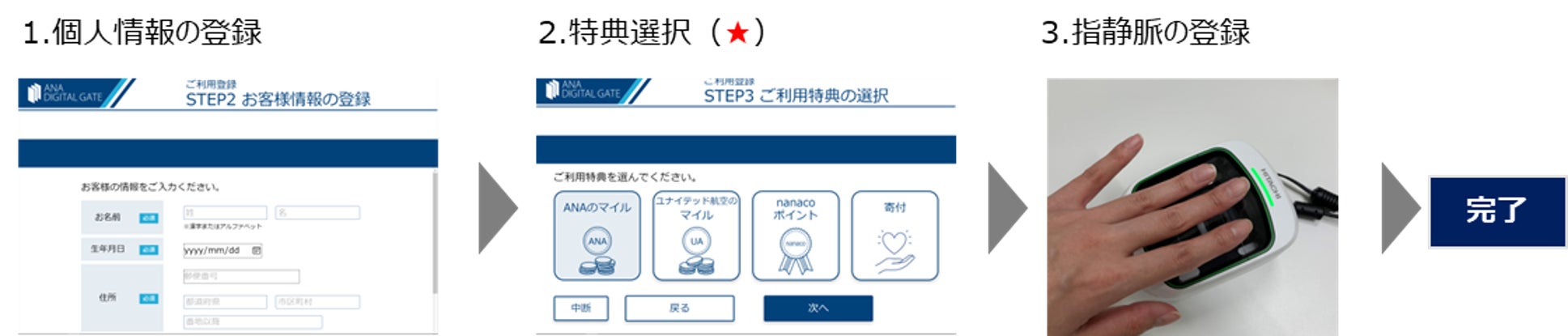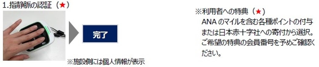 そこで今回、手書きで記帳していた利用者の個人情報と指静脈情報を、専用端末で初回登録すると、2回目以降は、指静脈認証端末へ指をかざすだけで、安心・安全、スピーディーにチェックインすることができる、指静脈スマートチェックインの実証実験を実施することとなりました。また、利用者に対して初回登録時と2回目以降の指静脈スマートチェックイン時にANAのマイルを含む各種ポイントを付与します(日本赤十字社への寄付を選択することも可能です)。生体認証とANAのマイルを含む各種ポイントが付与できるシステムは、国内初となります。