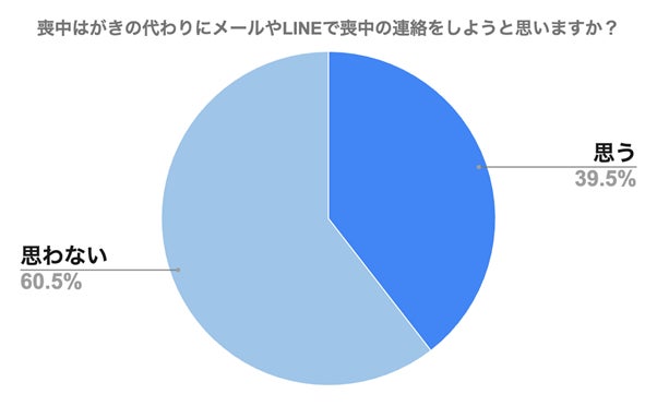 「今後、あなたが喪中になった場合、喪中はがきの代わりにメールやLINEで喪中の連絡をしようと思いますか?」という質問に対し、200人中79人(39.5%)が「思う」と答え、121人(60.5%)が「思わない」と回答しました。