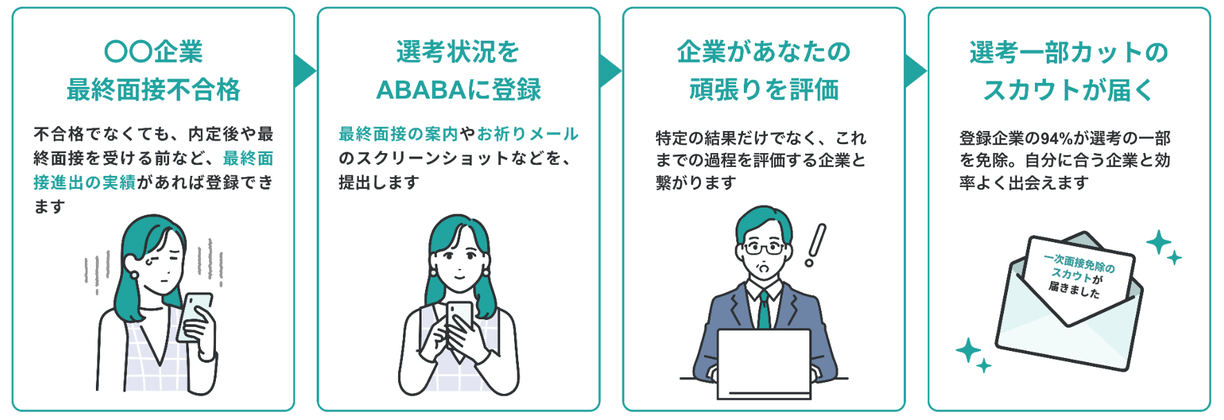 『ABABA』は最終面接まで進んだことのある就活生だけが登録できるダイレクトリクルーティングサービスです。学生はサービス登録時に最終面接まで進んだ企業の情報を提出することで、その実績を見た企業からのスカウトを受け取ることができます。