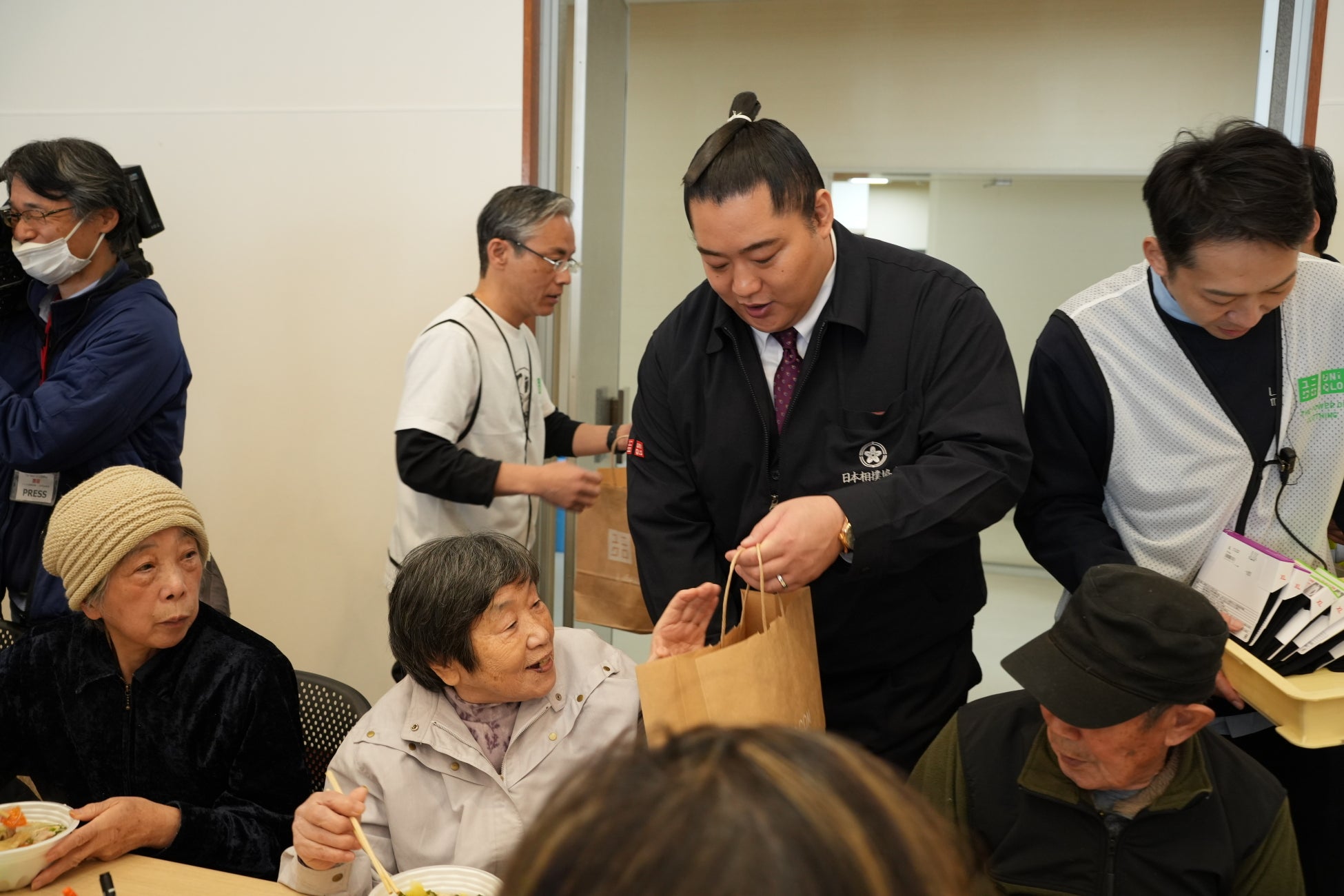 さらに、石川県の食材を使用した日本相撲協会特製ちゃんこが振る舞われると、参加者からは「美味しい!」、「あったかくて嬉しい」といった喜びの声が多く寄せられ、親方・力士が参加者たちと一緒にちゃんこを食べる場面も見られるなど、温かな交流が広がりました。
