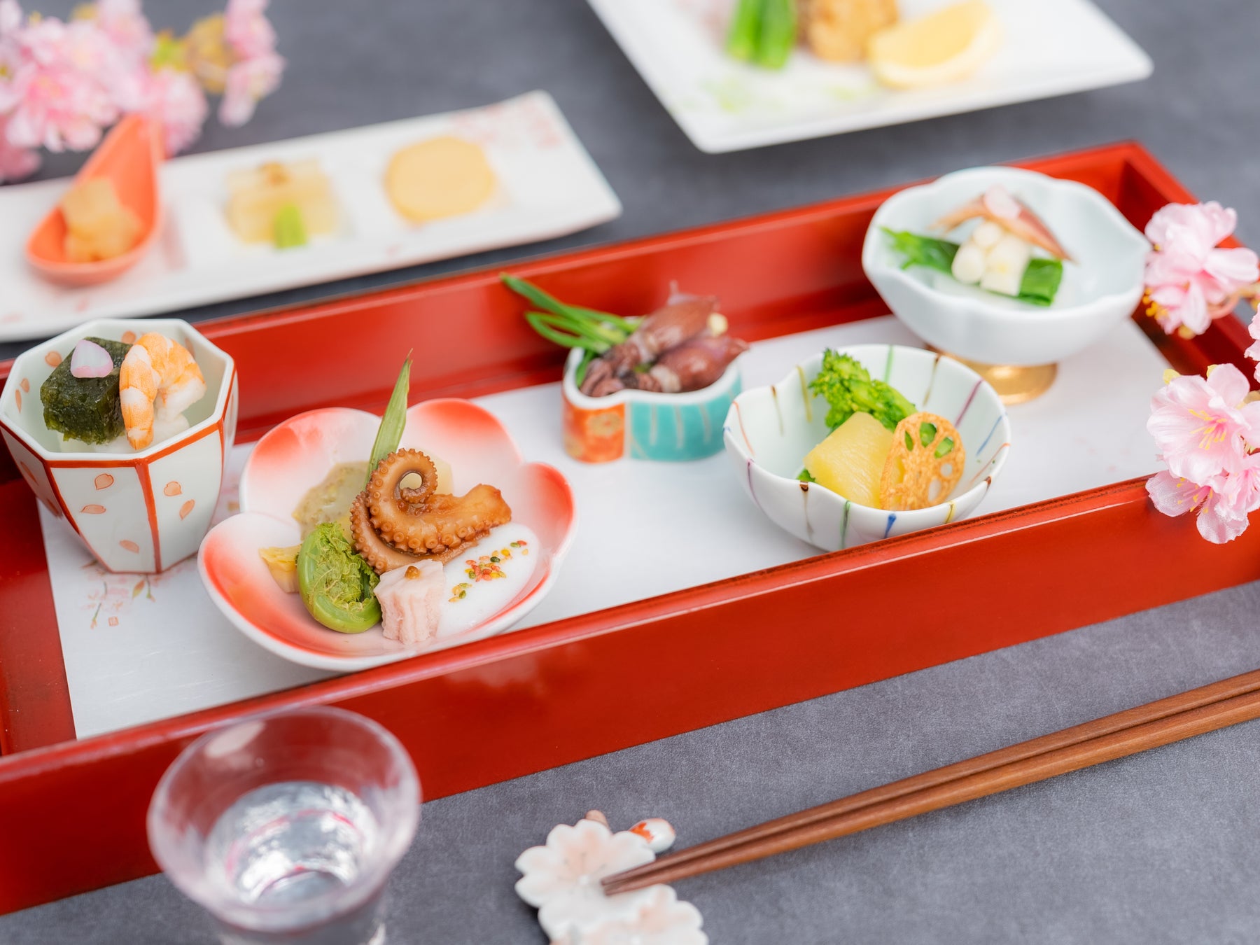 前菜はうるいやこごみなどの山菜や、旬のホタルイカや蛸などの海の幸を贅沢に使用した春らしい彩りの小鉢盛りをご用意。中でも使用される「小笹うるい」は、農林水産省の地理的表示(GI)保護制度に登録され、上山市の伝統野菜として知られています。うるい特有のぬめりが強く、シャキシャキとした食感を有し、食用として好まれる茎の白い部分が一般的なうるいに比べて2割程度長いのが特徴です。光沢がある鮮やかな外観と食味の良さから市場での評価も高く、一般的なうるいに比べて高価で希少なうるいをお召し上がりいただけます。