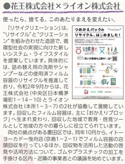 花王株式会社(社長・長谷部佳宏)とライオン株式会社(社長・掬川正純)、株式会社イトーヨーカ堂(社長・山本哲也)は、プラスチック包装容器資源循環型社会の実現に向けて、東京都墨田区※にあるイトーヨーカドー曳舟店において使用済みつめかえパック(以下、フィルム容器という)の分別回収実証実験を行なっています。
