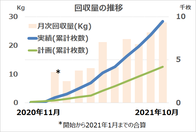 ※累計回収量170.2Kgを18.0g/枚としてフィルム容器枚数に換算 (2021年7月報告時は14.4g/枚で枚数換算)