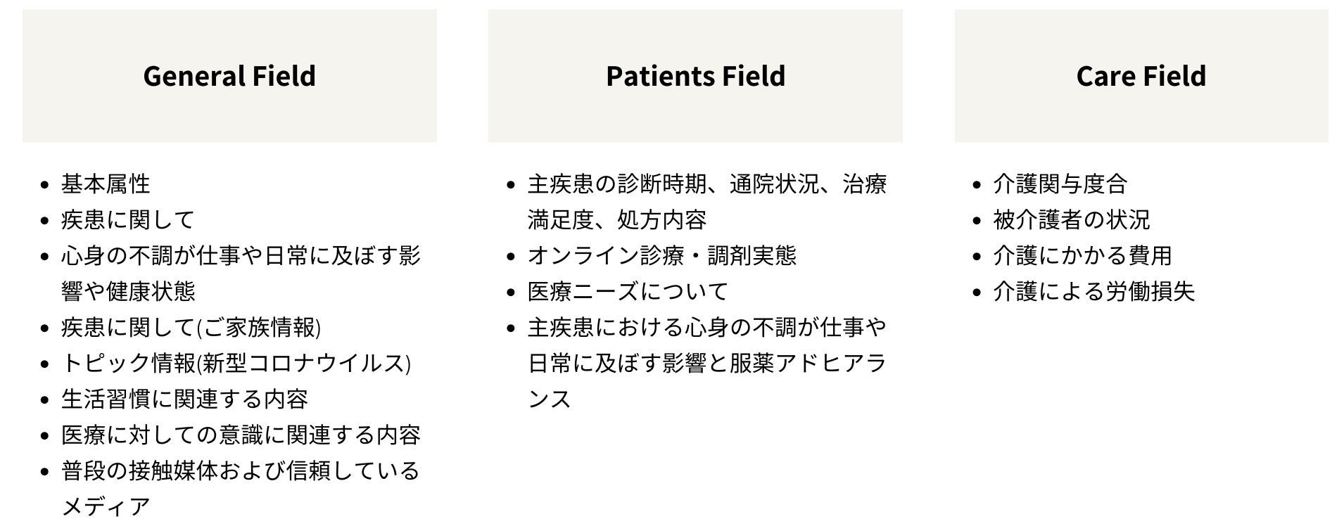 700を超える症状・疾患情報の収集を行っており、未病から特定疾患まで広範囲のデータが分析可能です。生活の質(QOL)や年収といった情報も収集しており、電子カルテやレセプトデータには含まれない貴重なデータが得られます。