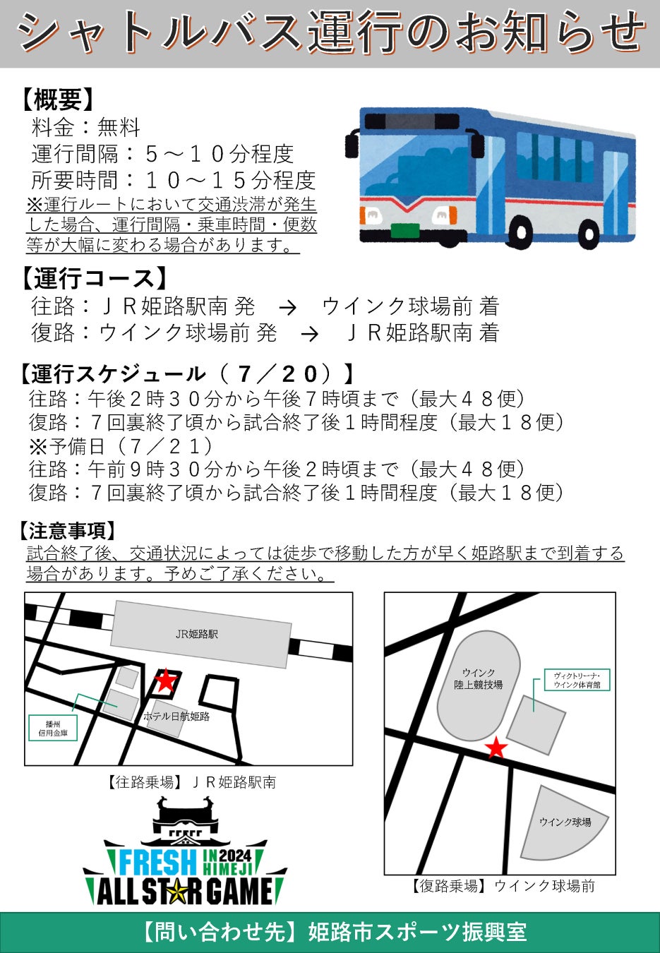 プロ野球フレッシュオールスターゲーム2024において、周辺区域の駐車場の混雑対策及び公共交通機関の来場を促進するため、姫路駅からウインク球場までの臨時シャトルバスを運行します。