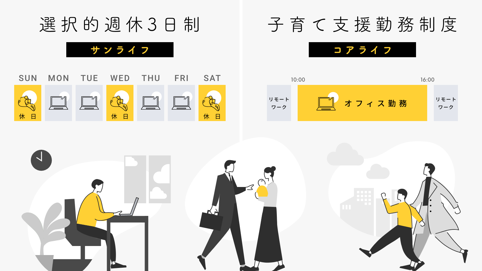 オロでは「より多くの人々(同僚・家族・取引先・株主・社会)に対してより多くの『幸せ・喜び』を提供する企業となる。そのための努力を通じて社員全員の自己実現を達成する。(一部抜粋)」という経営理念のもと事業を展開しております。従業員一人ひとりが多様で柔軟な働き方を選択することで、各々が自己実現を達成できるよう、選択的週休3日制【サンライフ】と子育て支援勤務制度【コアライフ】を導入いたします。