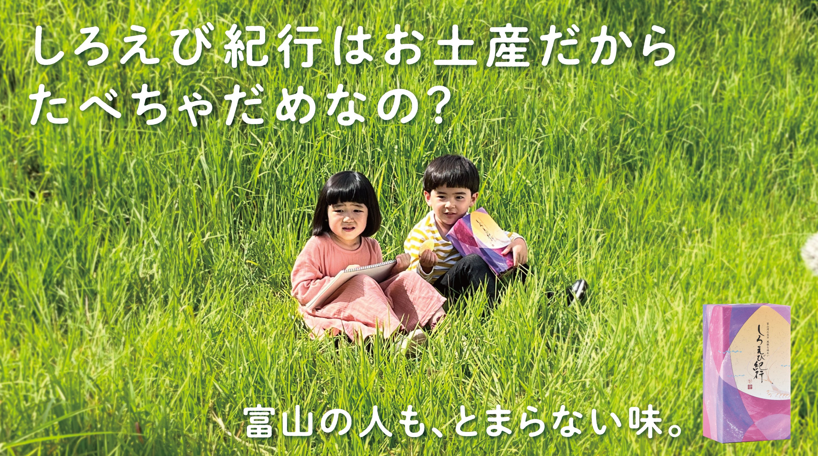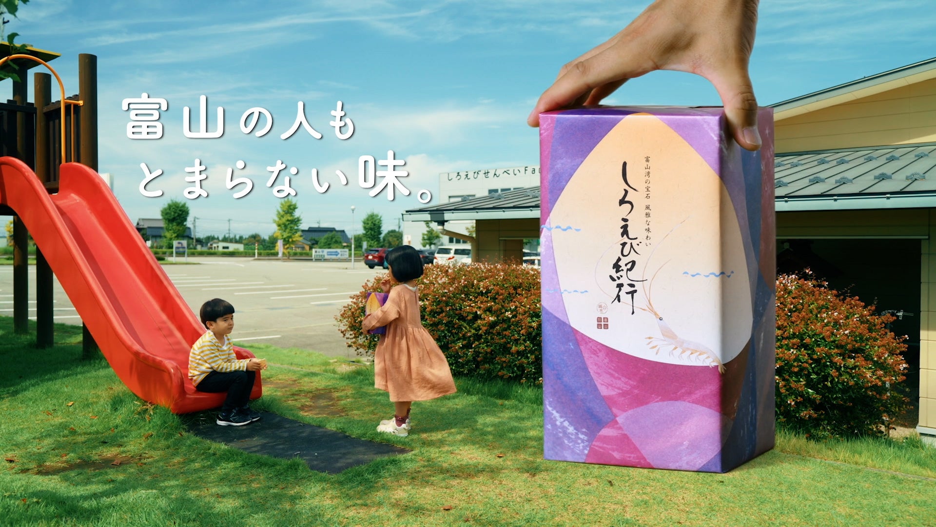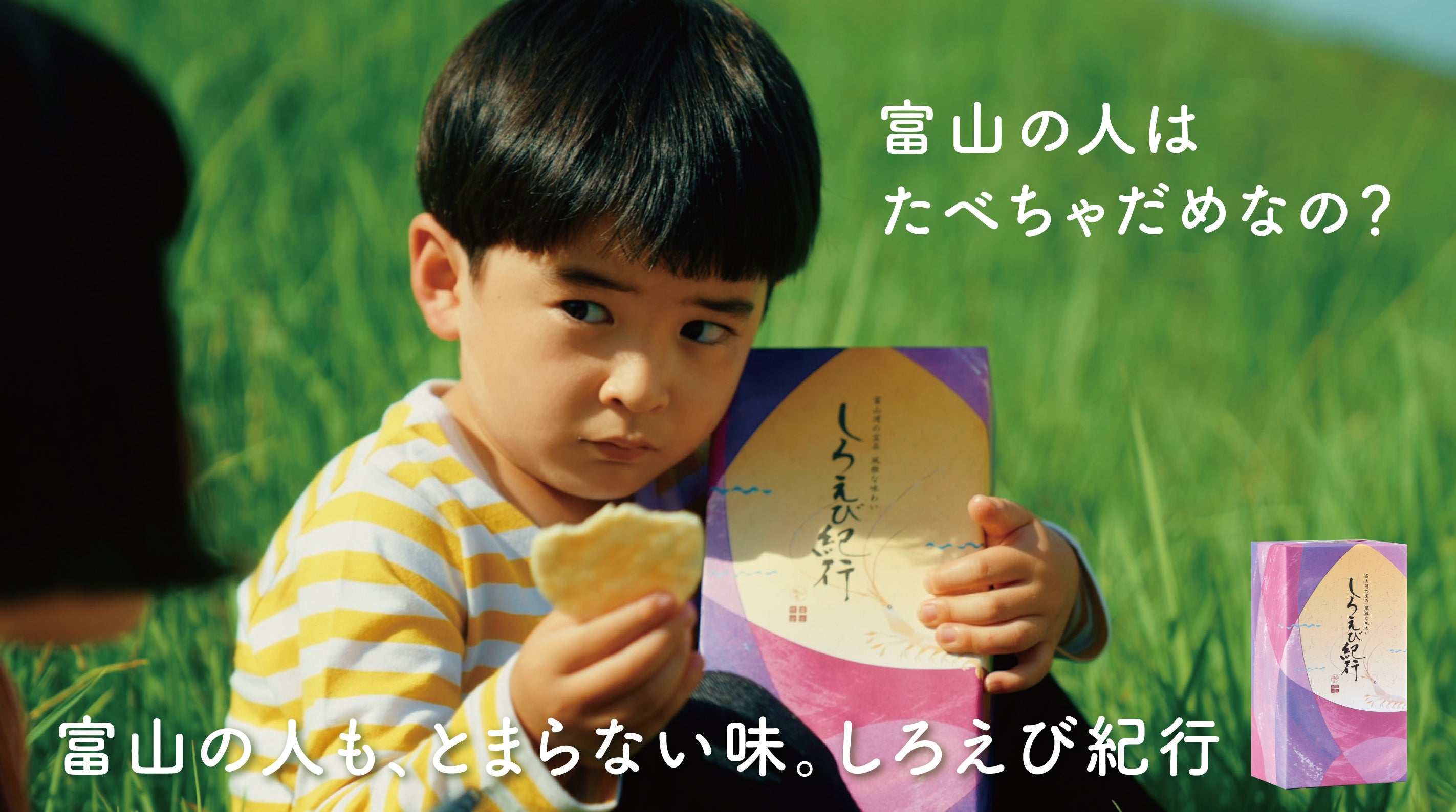 2022年11月から公開された「しろえび紀行CM」は、永尾柚乃ちゃん(4歳)と、秋山翔太くん(4歳)が登場し、「しろえび紀行が好きすぎる子供」を演じています。「しろえび紀行はお土産だから食べちゃダメだけど、美味しいからつい食べたくなってしまう」という子供の欲求を様々なシチュエーションで表現しています。シリーズ3篇を通じて、しろえび紀行を食べたくなる男の子と食べちゃダメと指摘する女の子の、子供ならではの微笑ましいやりとりにもご注目ください。