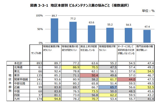 また、ビルメンテナンス業の悩みごとについて尋ねた質問では、「現場従業員が集まりにくい」が89.7%で1位、「従業員の若返りが図りにくい」が77.2%で2位となりました。人材確保にまつわる課題が多いことがわかります。