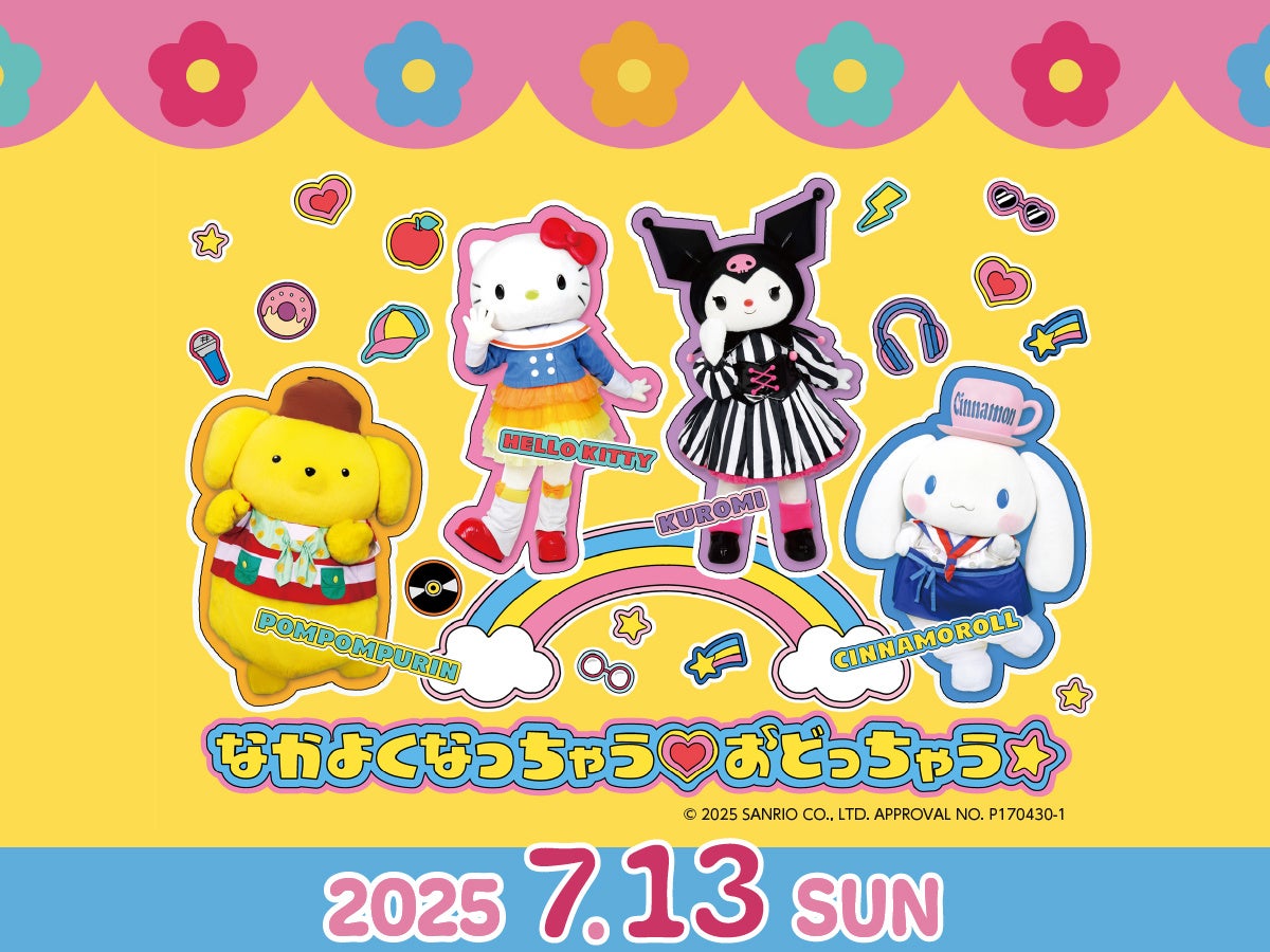 ・ハローキティ・クロミ・ポムポムプリン・シナモロールのうち、2キャラクターが登場!どのキャラクターかは、当日のお楽しみ♪