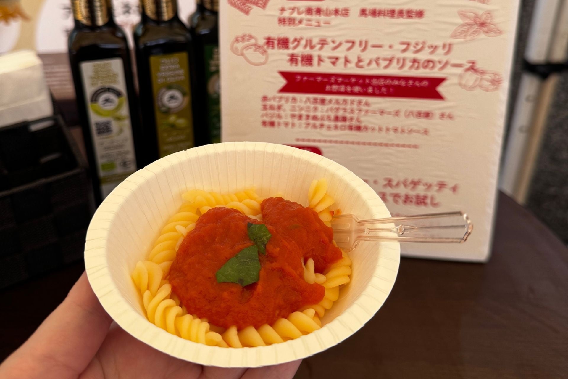 試食は、南青山の名店「ナプレ」が監修し、ソースの野菜にはアルチェネロのトマト製品やファーマーズマーケット出店者の野菜を使用したイベント限定の特別メニューを提供しました。