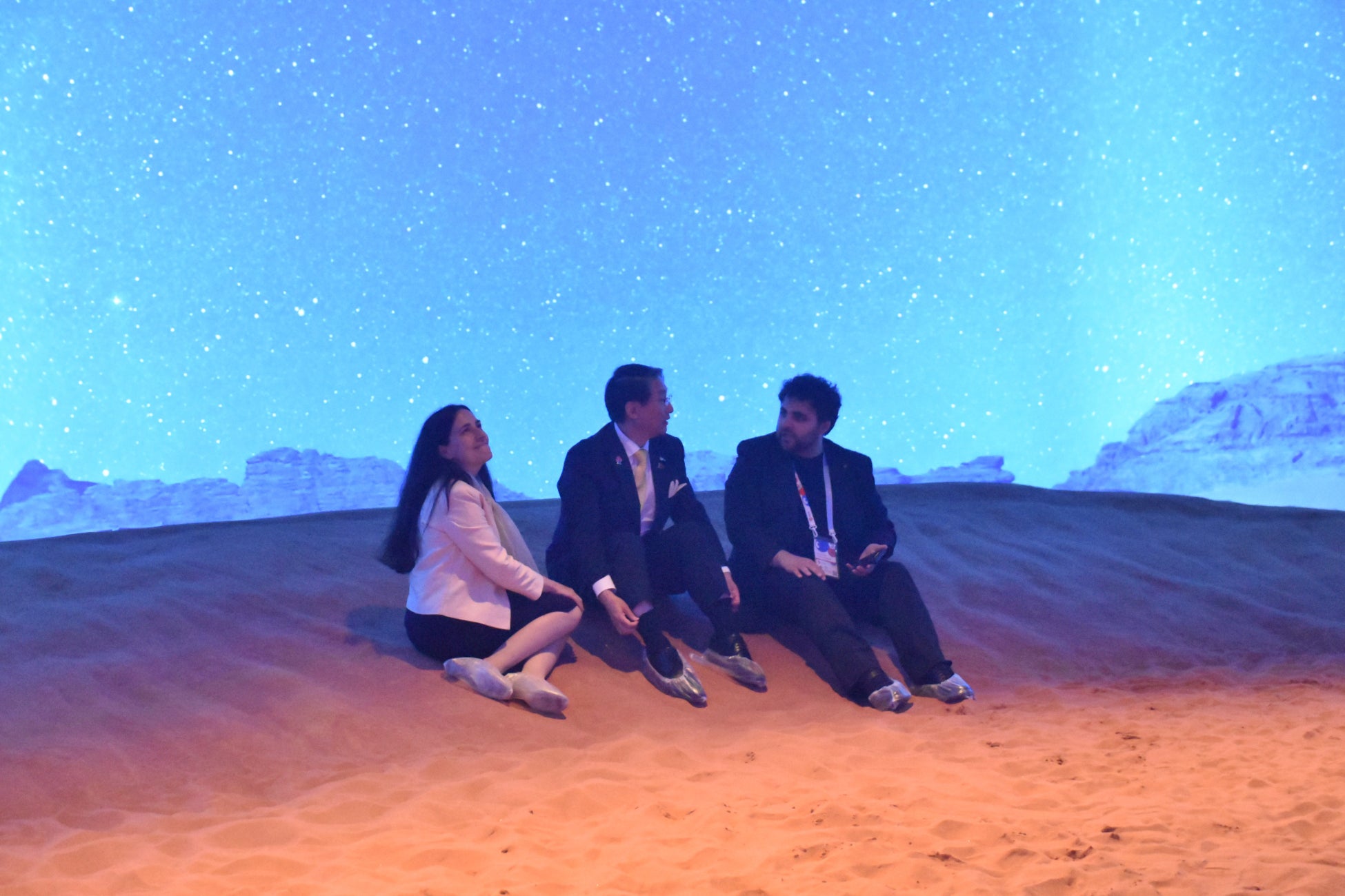 調印式のあとは両展示を一緒に体験し、地域の魅力を共有し合いました。鳥取県ブースを訪れたシファ政府代表代行は、虫眼鏡型デバイスを体験しながら「素晴らしいコンテンツで(鳥取県に)行きたくなりました。素晴らしいアイデアとプロデュースだと思います。」とコメント。また、ヨルダン館を訪れた平井知事は砂の感触を確かめながら「鳥取よりも細かい感じがします。万博という素晴らしい機会に友情を結び合う、しかも砂で交流していく、そんな1日が始まった気がします。」とコメントし、今後も両パビリオンで協力してその魅力を発信していくことを宣言しました。
