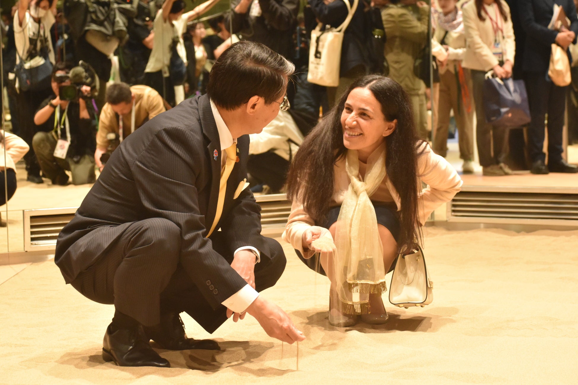SNS上で共通した砂の展示が話題になったことがきっかけでうまれた本同盟ですが、調印式は終始和やかな空気のなか執り行われました。平井知事は「今日こうしてヨルダンのパビリオンとサンド・アライアンスを結ぶことができました。企画が”砂被り”していましたが、素晴らしい展示をお互いに提供しあうことができ、この万博が開かれたことで、砂で”すながる”(繋がる)ことができたと思っています。」と、大阪・関西万博をきっかけに新しいつながりができたことに喜びのコメント。