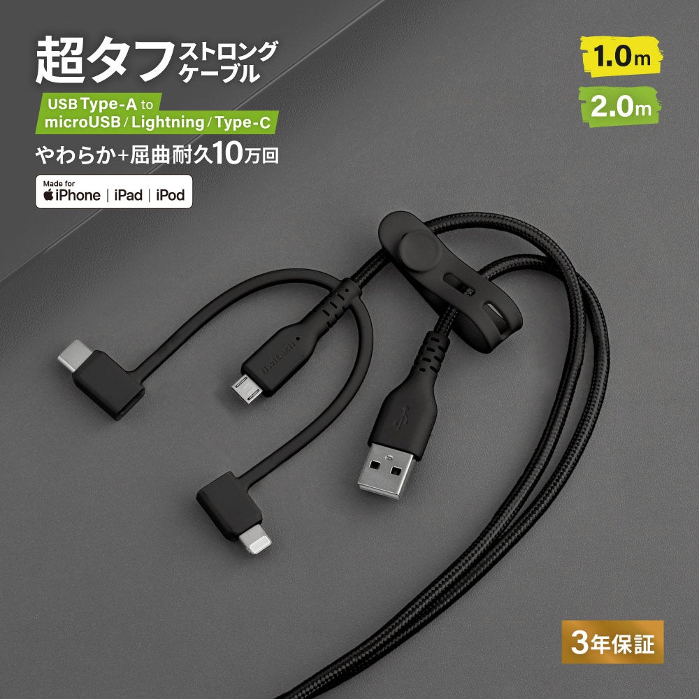 【超タフケーブルが柔らかくなってリニューアル】「やわらかさ」をプラスすることで高耐久性と使い勝手の良さを両立した超タフケーブルを新発売。