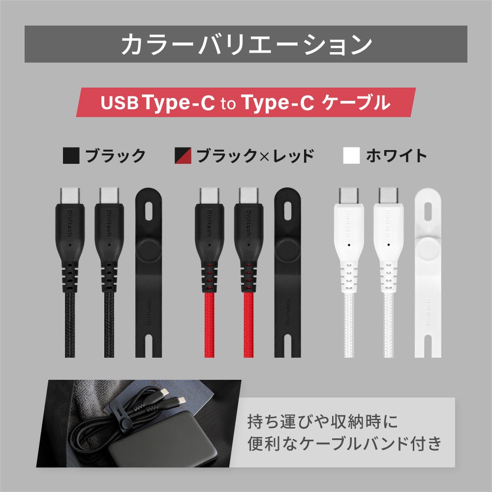 ケーブルの収納に使えるシリコンケーブルバンドが付属しています。ケーブルの収納以外にも袋留めや傘の目印など、さまざまな場面でもお使いいただけます。