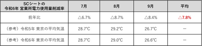 自動車営業所の令和5年と令和6年の使用電力量を比較し、低減率を算出した結果を表1に示す。その結果、SCシートの施工により、夏季において最大8.7%、平均では7.8%、営業所の使用電力量低減効果があったことを確認できた。なお、両年において東京の平均気温に大きな差が無かったことから、外気温による使用電力量への影響はほぼ無いと推測される。
